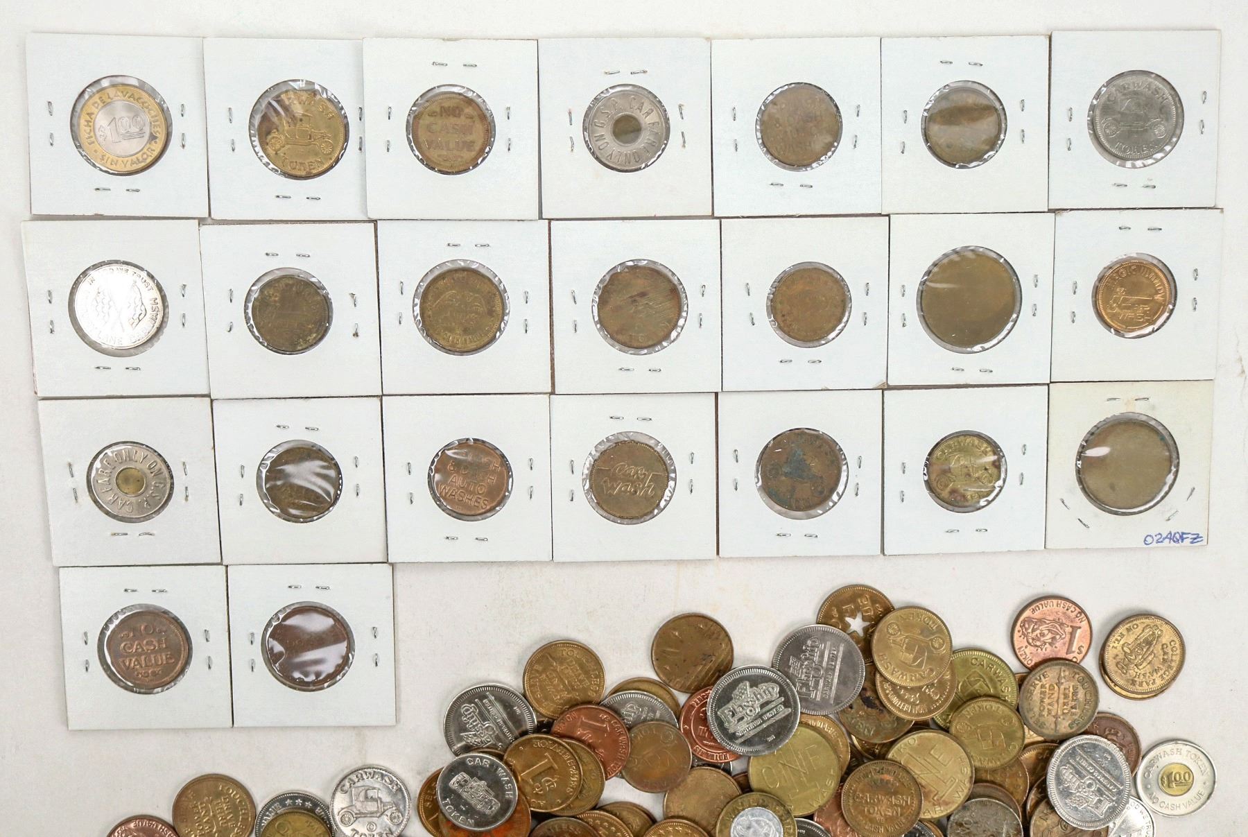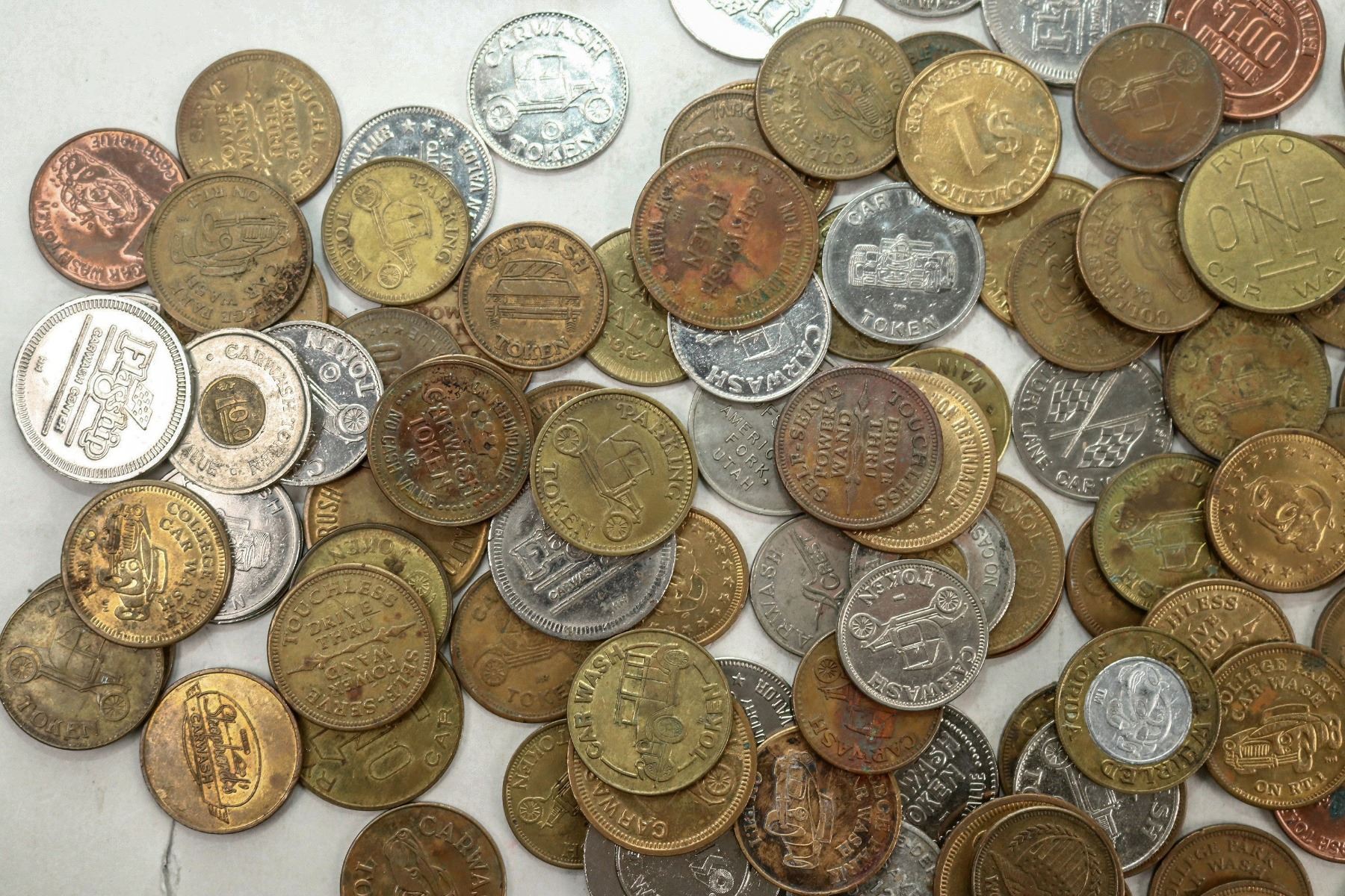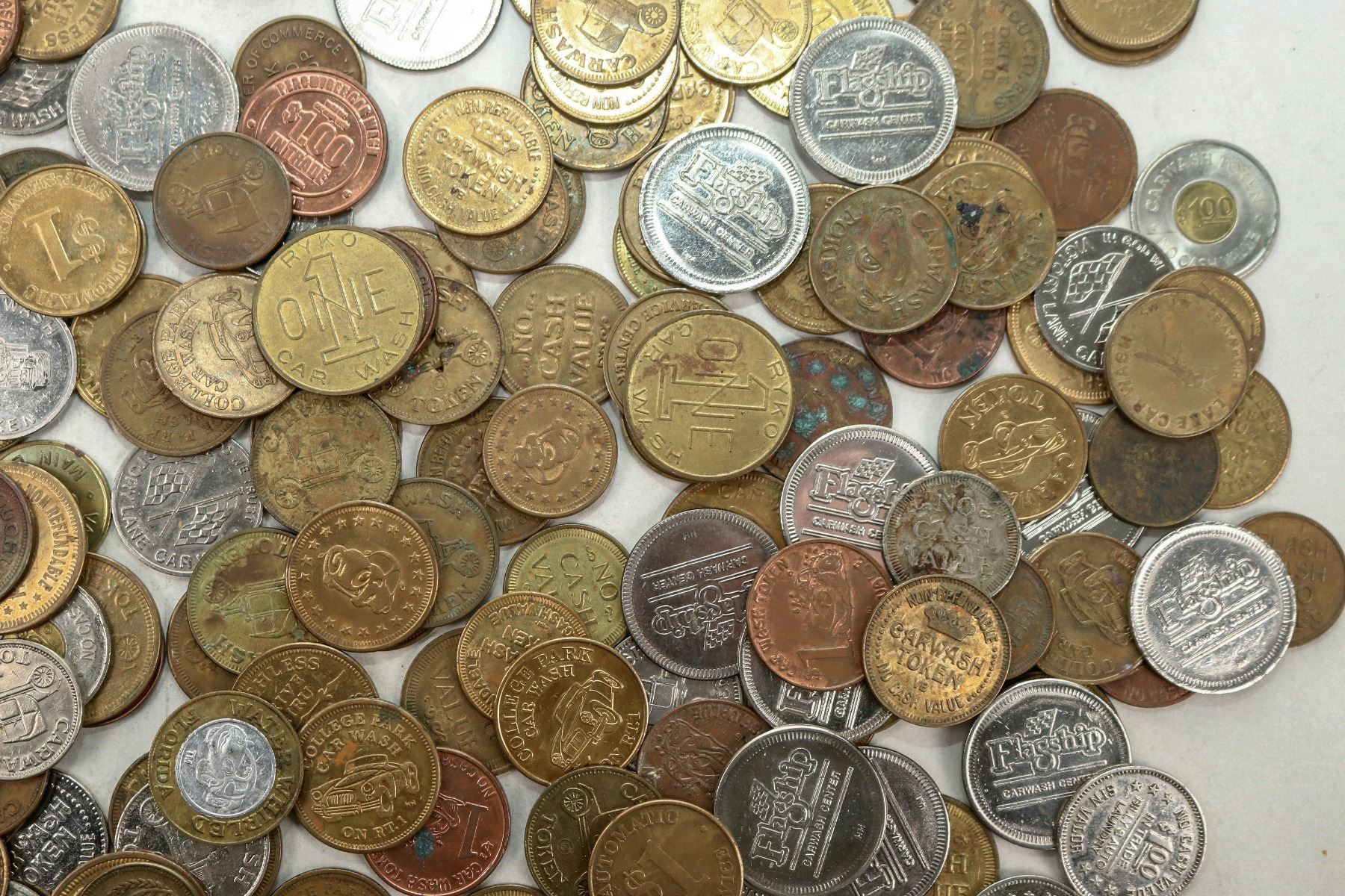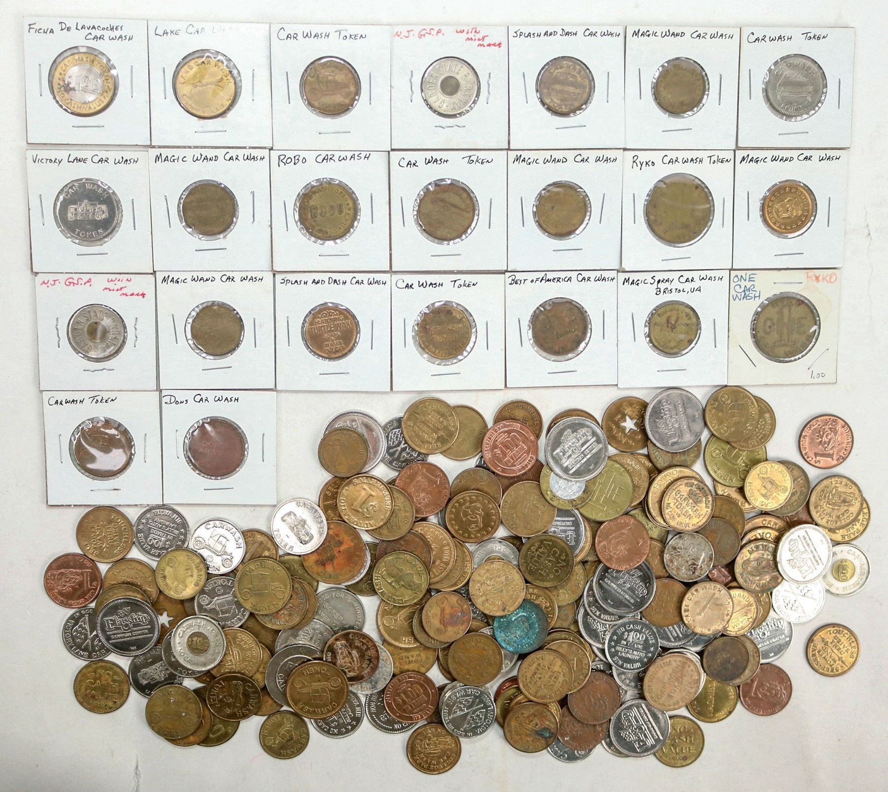 About 200 car wash tokens: Splash and Dash; Robo Wash; Victory Lane; Lake; Sofspra; Magic Wand.