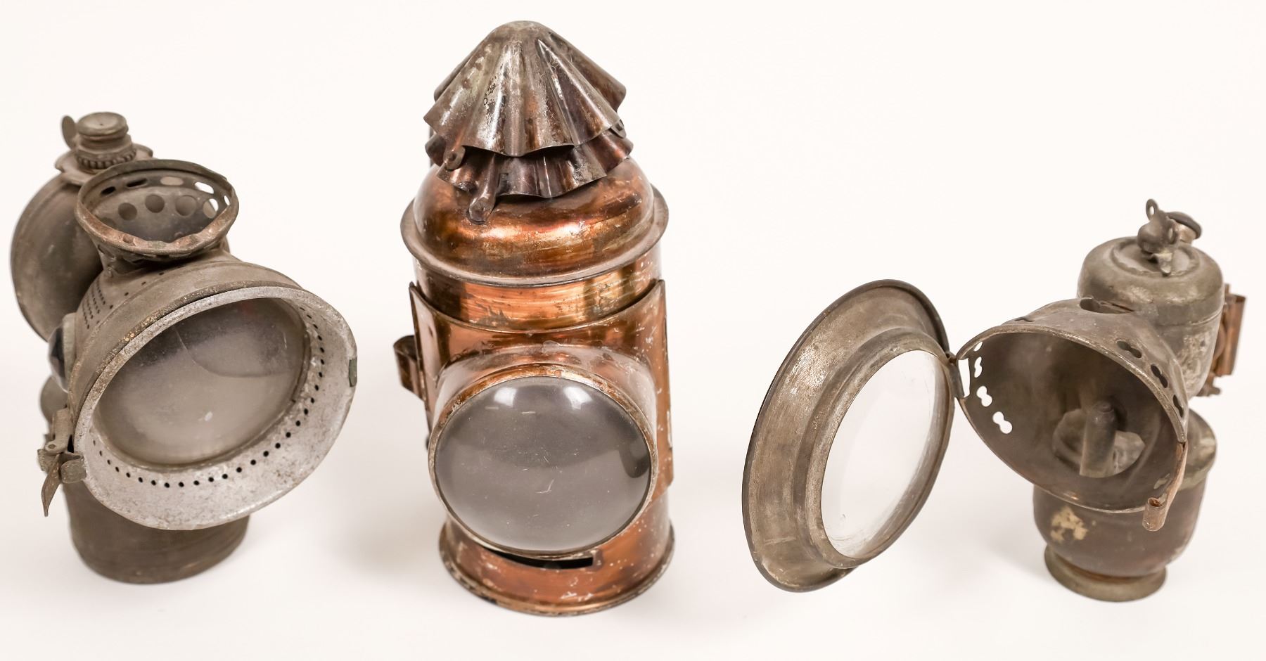 Two carbide bicycle lamps from the late 1800s and a handheld, dual-wick oil lamp. The larger bike lamp has a clear (but cracked and frosted from use) 2.5-inch diameter front lens and a red and green jewel lens on the right and left sides. Overall, this one is about 6.5 inches tall. The chimney is missing its original cap, and the lamp is in well used condition. The other bike lamp has a 3-inch clear lens, uncracked, and the whole thing is about 5.5 inches tall. This one has a pantograph-style shock absorber where it mounts onto the bicycle. Third is an metal oil lamp with a 2.75-inch magnifying lens on the front and a two-wick oil burner inside. This lamp is about 8.5 inches tall and 3.25 inches in diameter, and it can either be mounted on something with the hook on the back, or two metal loops can be folded back to make a handhold for it.