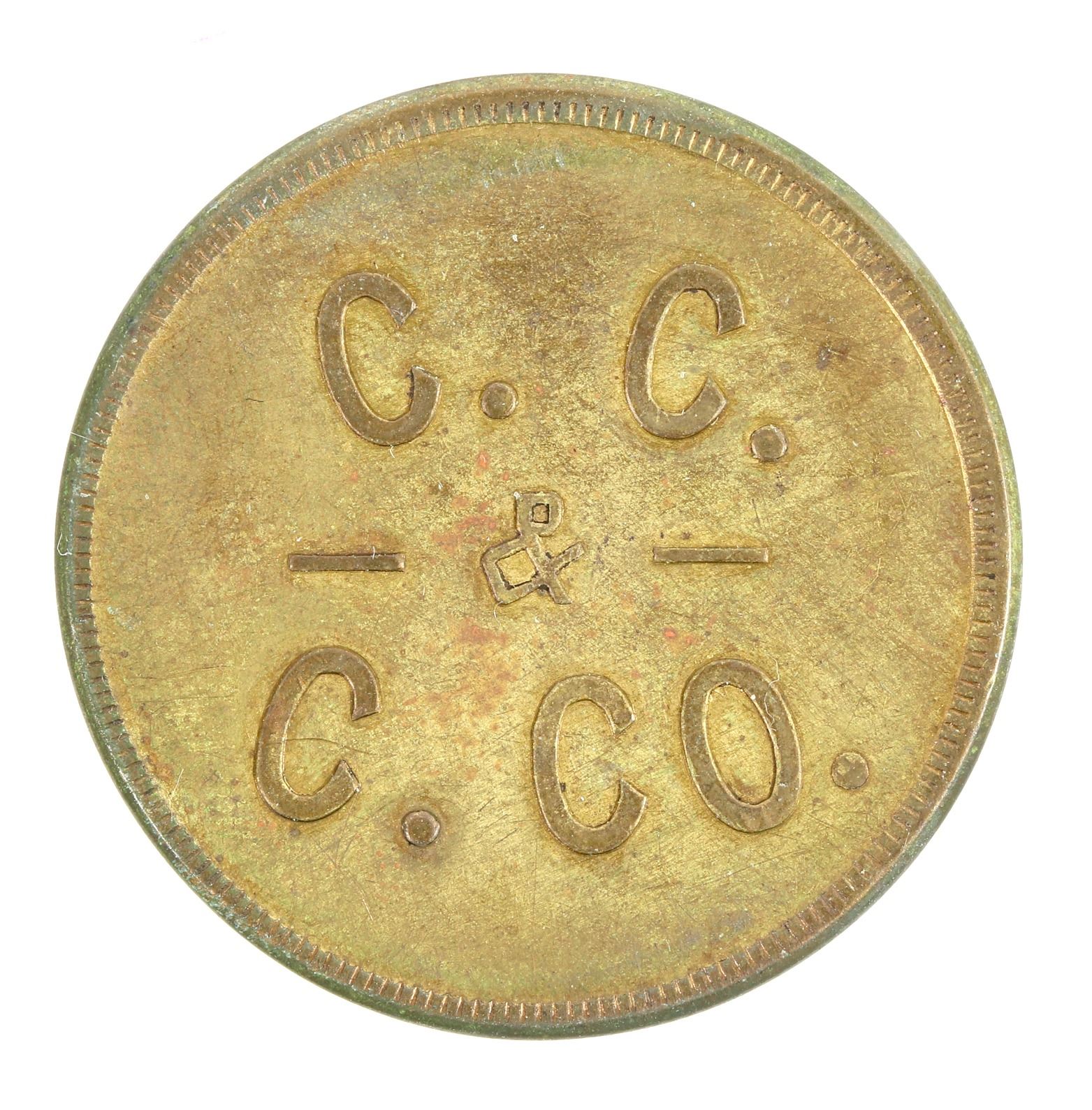 C.C. / & / C. Co. // One / Stick / Powder. Brass, round. Carbon Coal & Coke Company. Cokedale, Colorado. 1.25"