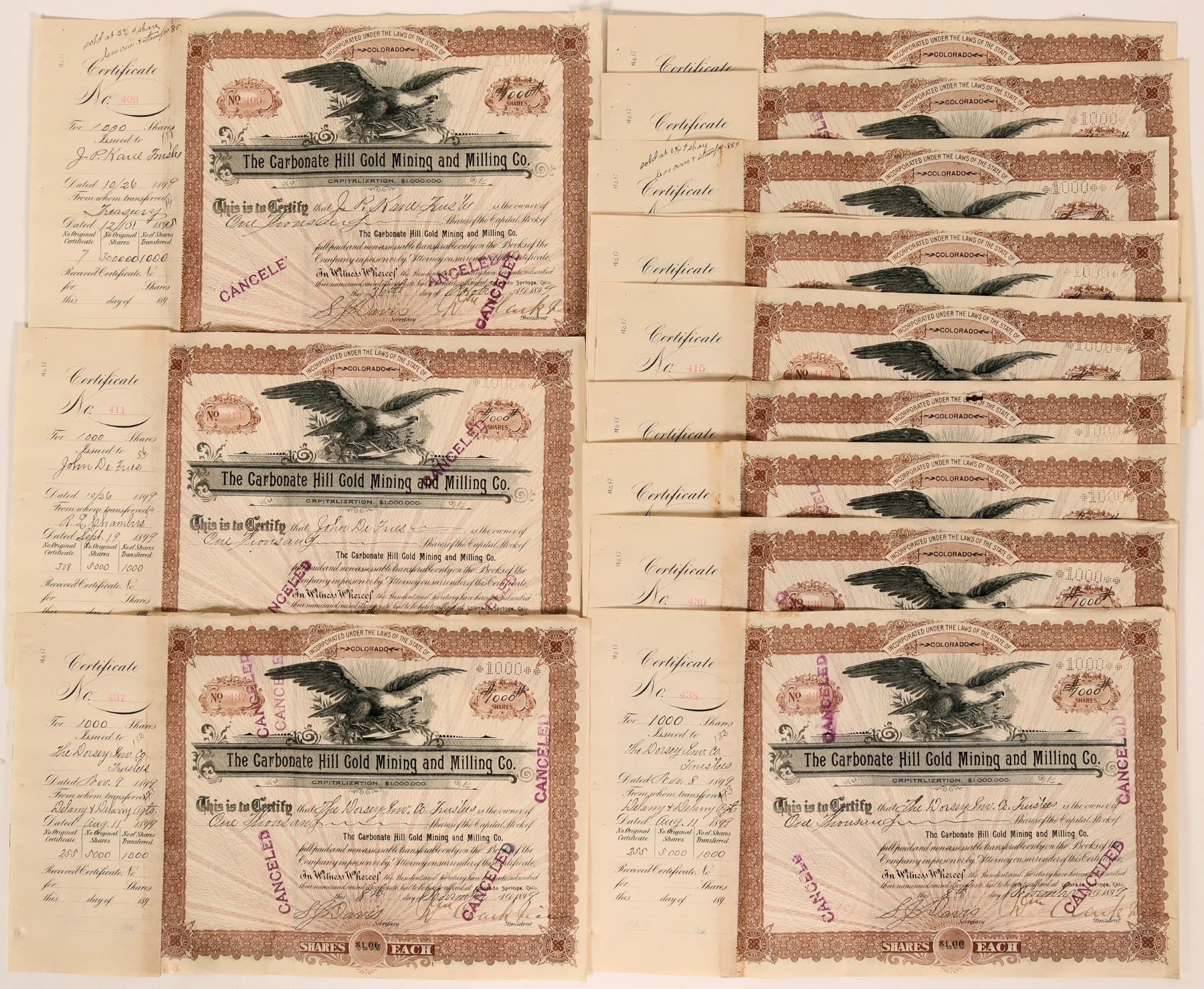 Lot of 14, all issued and stamp cancelled in 1899. Signed by vice-president William Clark and secretary Davis. Brown border, black print, and eagle vignette. Stubs attached. Many are consecutive numbered. Folds, creased corners. This company, incorporated in 1895 in Colorado, owned the New Year and Hustler Lodes on Copper Mountain, according to Hills.