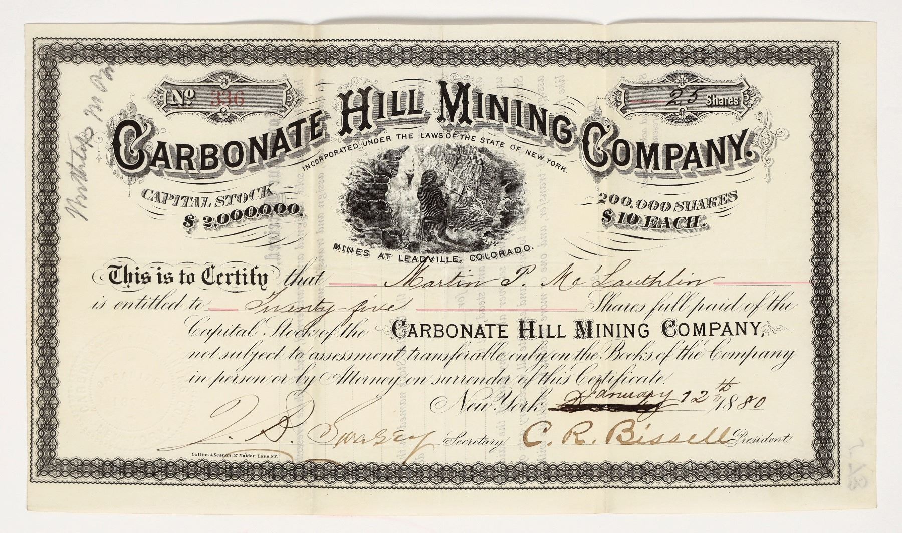"Mines at Leadville, Colorado" printed under mining vignette. Inc. in New York. No. 336, issued for 25 shares to Martin McLauthlin in 1880 in New York. Signed by president CR Bissell and the secretary. Not cancelled. Black border and print with underground mining vignette. Pinholes, deep folds. It is possible this company became the Carbonate Hill Consolidated MC. The Carbonate Hill Consolidated owns three claims on the northwest end of the Carbonate. The workings have been conducted on the Pocahontas claim. The shaft is 240 feet deep and at 180 feet contact was cut and drifts are being run southeast and east. The prospects of the mine are very good at present." [Engineering and Mining Journal, Volume 35, 1883]