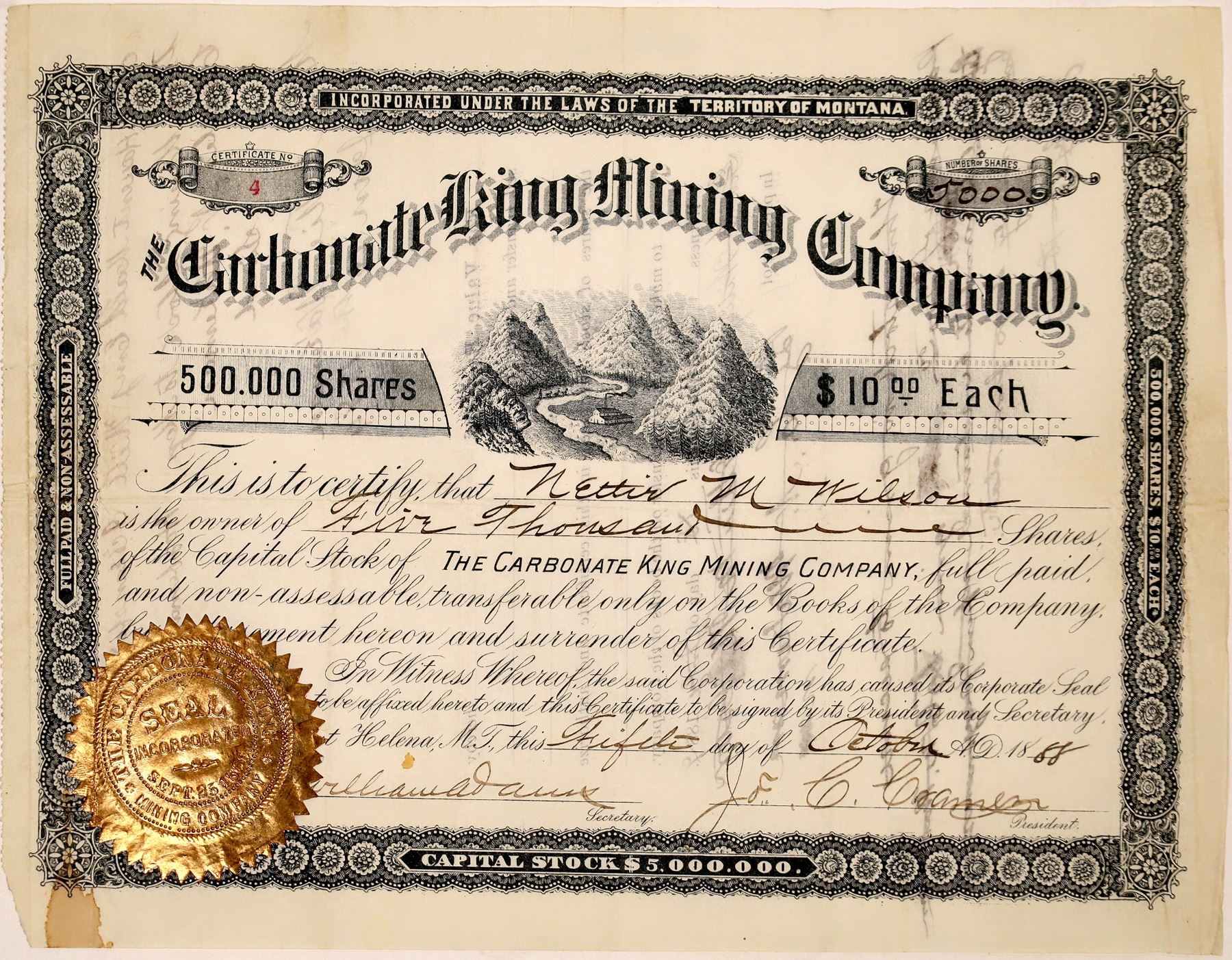 Issued to Nettie Wilson, 5,000 shares at $10 per by The Carbonate King Mining Company. Signed by both secretary and president. This is dated October 5, 1888. Please see photos for more detail and condition. The company filed a placer claim in Deer Lodge County in 1892. [Anaconda Standard, May 5, 1892] In 1899, the company was bought by Pennsylvania interests. At that time, it consisted of 9 quartz patented claims and 160 acres on the Little Blackfoot, 3 miles south of Elliston. [Independent-Record, Mar 30, 1899]