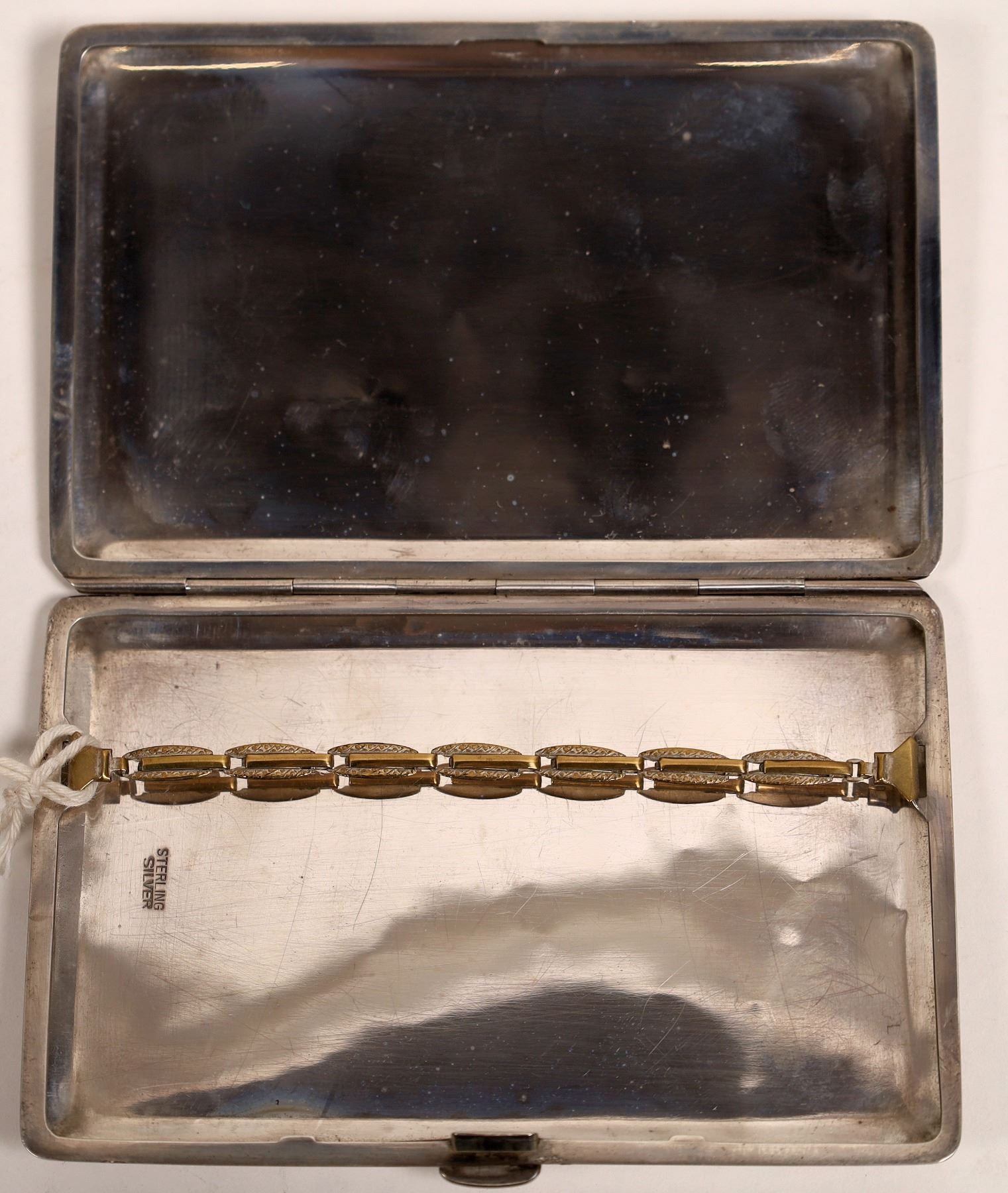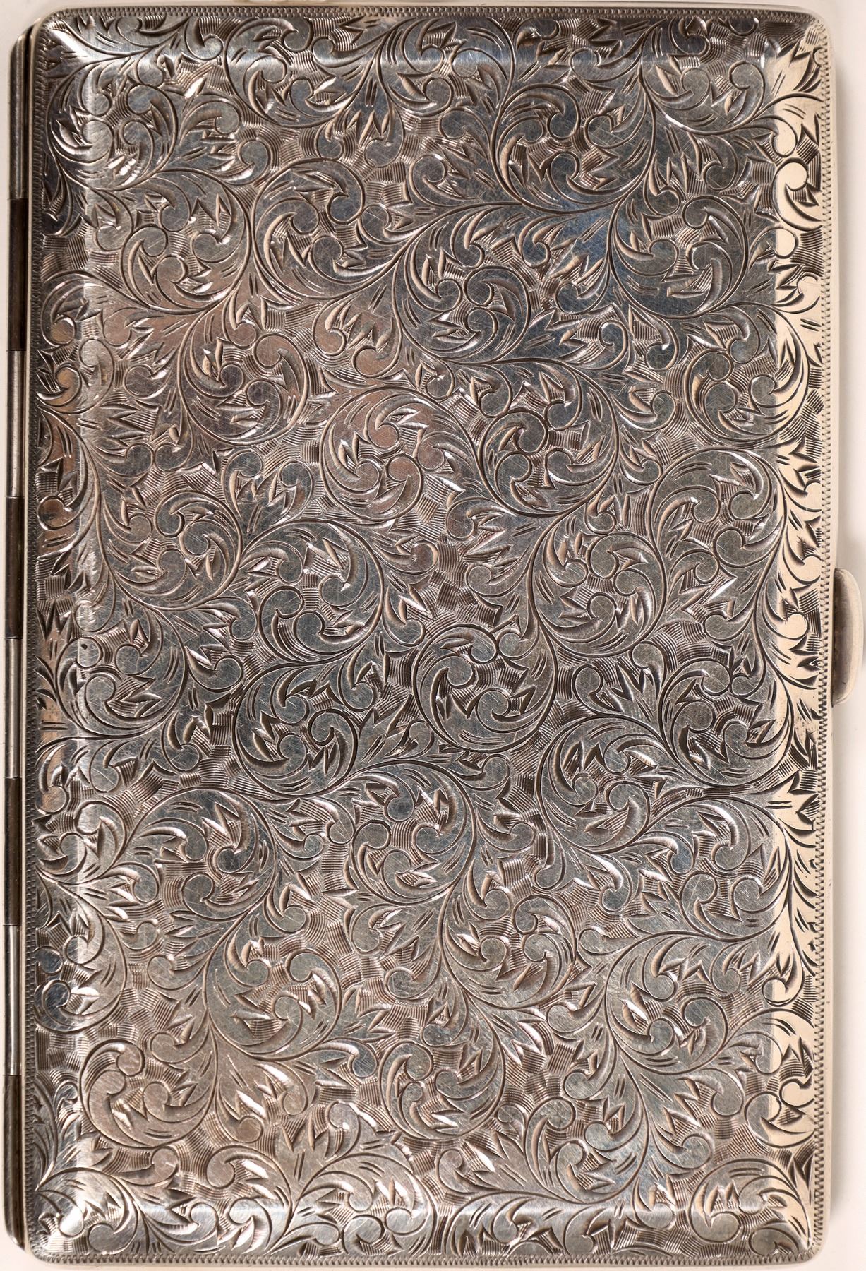 Sterling silver cigarette case, approx. 5 x 3.25 inches, about 148 grams total weight. It has a beautiful filigree pattern carved into both front and back, and it could easily carry your credit cards, folded cash, or business cards instead of cigarettes. Inside is a flexible, removable brass chain made of seven, spring-loaded links. Front has initials JFS in the top-left corner. Excellent condition.