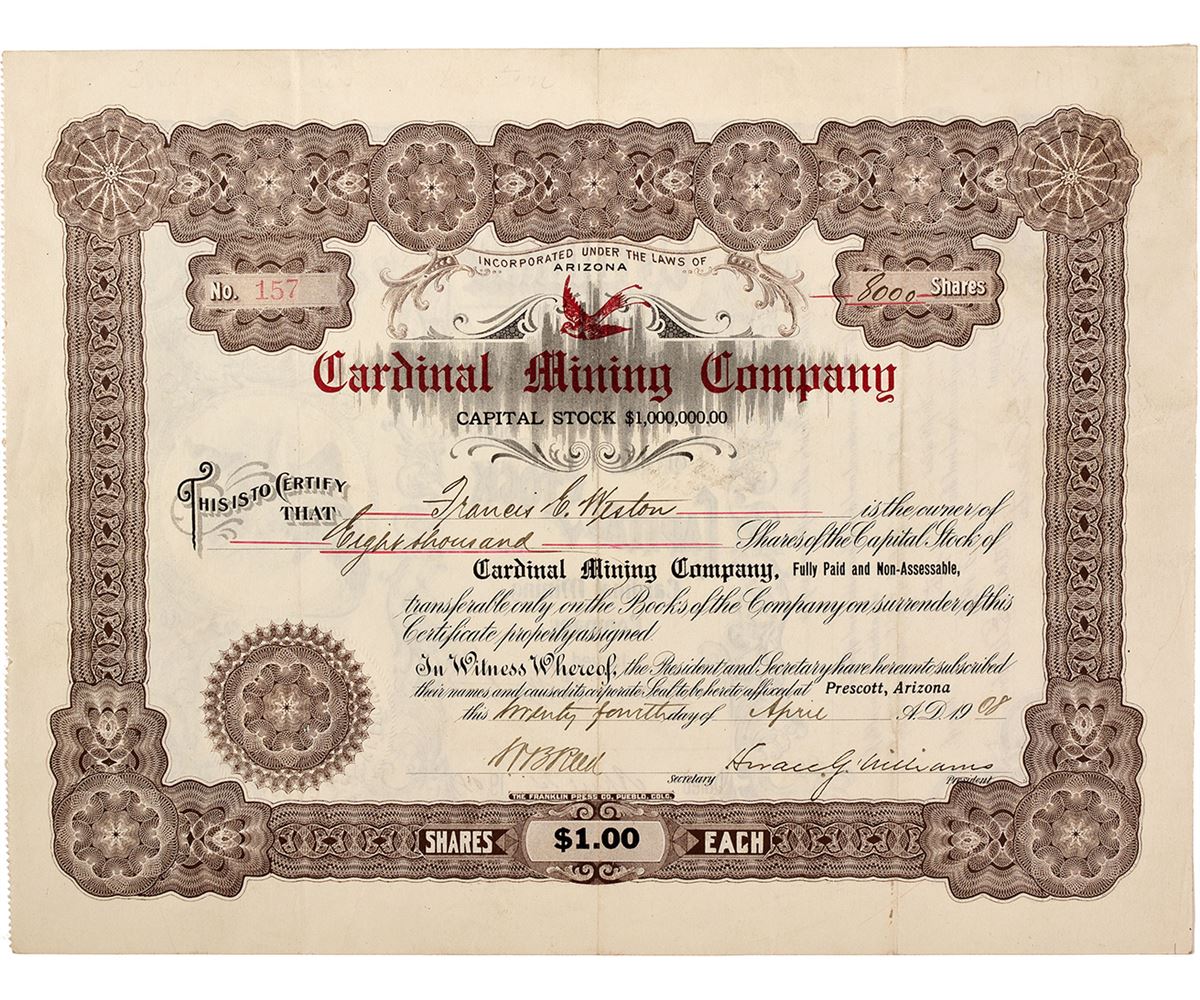 Number 157 issued to Francis Weston for 8,000 shares of capital stock valued at $1 per share. Signed by President H Williams. Incorporated (in 1907) Under the Laws of Arizona - Mine located in Yavapai County near Poland, Arizona. Ore contained a large amount of free milling gold, as well as copper, lead and zinc. Picture on the front shows a bright red Cardinal (bird) in flight. U/C. Printed by Franklin Press Company.