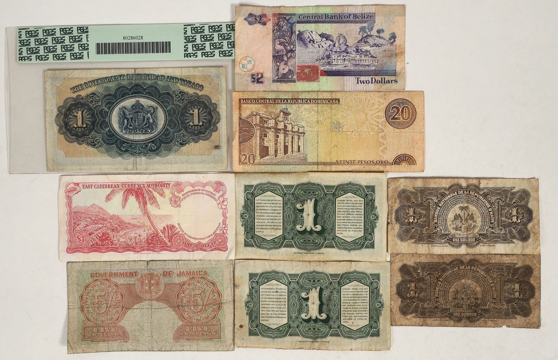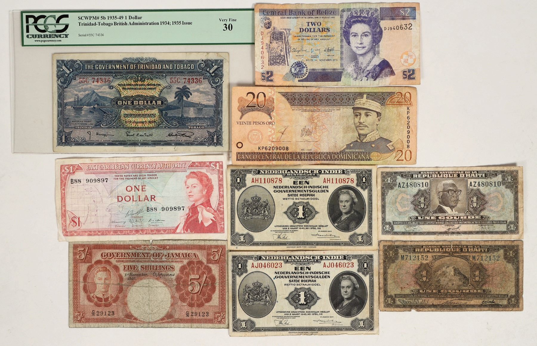Nine pieces of currency from Caribbean countries: Jamaica, Dominican Republic, Dutch Indies, Trinidad-Tobago (PCGS VF 30 1934 $1), Haiti (2), Belize.