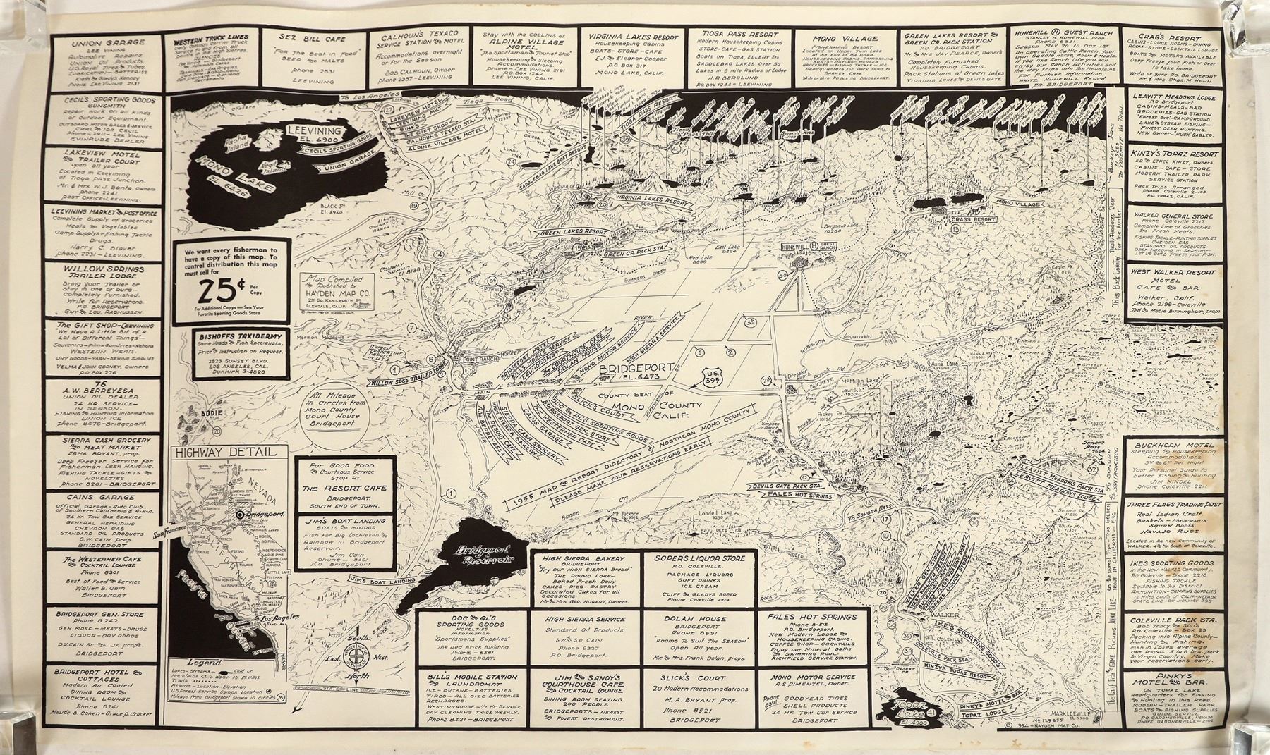 Characture map of Bridgeport Calif and surrounding area incl. Mono Lake, 27 x 17". In excellent cond. This is very rare. C.1954, Hayden Map Company.