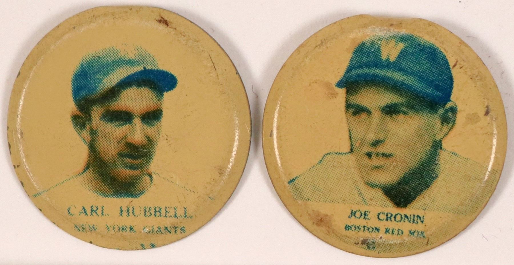 Lot of two 22 mm lapel pins: Carl Hubbell, New York Giants; and Joe Cronin, Boston Red Sox. Joseph Edward Cronin was a Major League Baseball shortstop, manager and general manager. He also served as president of the American League for 14 years. Carl Owen Hubbell, nicknamed "The Meal Ticket" and "King Carl", was a pitcher for the New York Giants of the National League from 1928 to 1943.