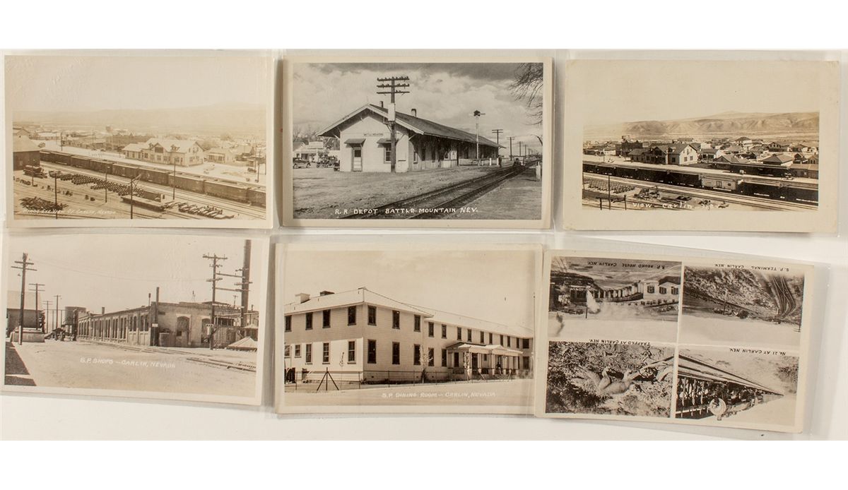 This is a lot of 6 post cards from the small towns of Carlin and Battle Mountain. Five of the post cards show various images of Carlin around the Southern Pacific railroad: the Carlin S.P. shops, engine no. 21, the S.P. Terminal, the S.P. Round House and the S.P. dining hall. The last piece is from Battle Mountain and it shows the railroad depot. The post cards have medium contrast and sharp focus with some wear.City: County: State: NVDate: c1920