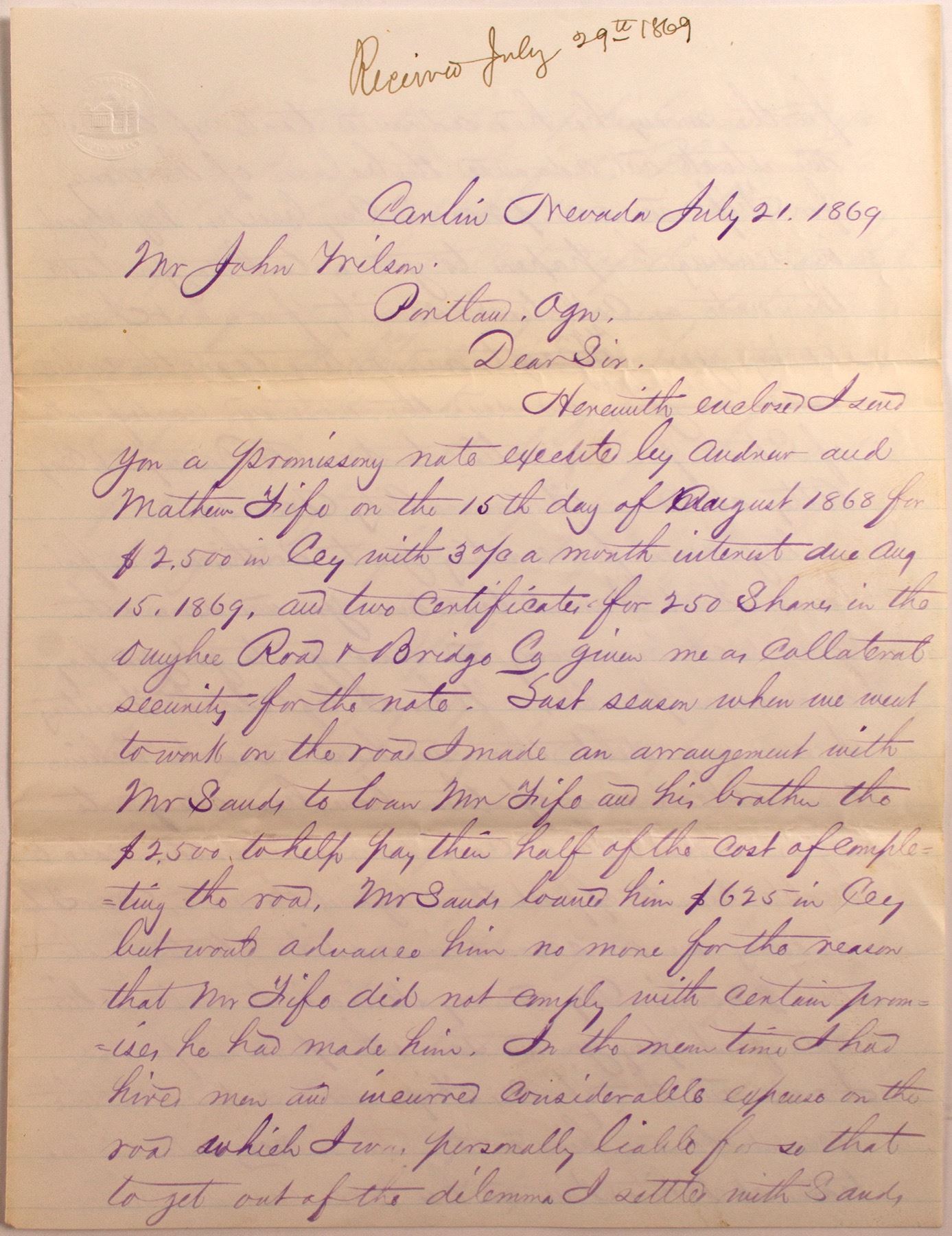 Letter about the building of the Owyhee Road & Bridge Company in 1868. Dated July 21, 1869 and datelined Carlin, Nevada. From Thomas. H. Smith to Mr. John Wilson of Portland. "Herewith enclosed I send you a promissory note executed by Andrew and Matthew Fife on the 15th day of August, 1868 for $2,500 with 3% a month interest due Aug. 15, 1869, and two certificates for 250 shares in the Owyhee Road & Bridge Co. given me as collateral security for the note." Andrew Fife won the contract for the road and he hired Smith to build it. Smith claims that the Fife's owe him $4,500 and asks Wilson to forward all documents to William Davenport of Treasure Hill. He is the acting Judge for White Pine and Elko counties. Smith wants to money to pay debts to people in Nevada, Oregon and Idaho. He does understand Fife's problem, however, "If the road was valuable, Mr Fife would no doubt pay my demands and redeem his stock but owing to that part of the country being almost deserted that in common with most other property has little or no value at present." Smith built (or upgraded) the road from Paradise Valley to Three Forks. It was known as the Military Road in 1868 as it was the main route the military used to address the Indian problems in Paradise Valley in 1865 and 1867. Short biographies of Fife and Davenport. History of the road. Three page letter is in good shape. State: Nevada City: Carlin, Elko Date: HWAC# 99765