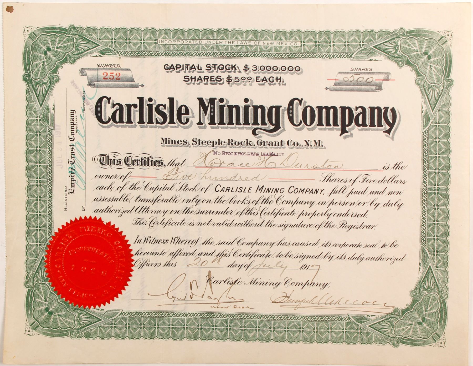 Five Hundred capital stock shares for Carlisle Mining Company, number 252 issued to Horace H. Durston on July 20, 1917. Ken Prag Collection. State: City: Date: HWAC# 82344