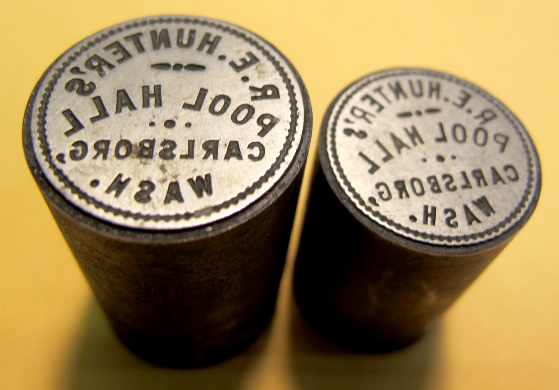 2 token dies self identified from Carlsborg, WA. 21 and 24mm: RE Hunters. Northwest Territorial Mint Historical Token Die Collection