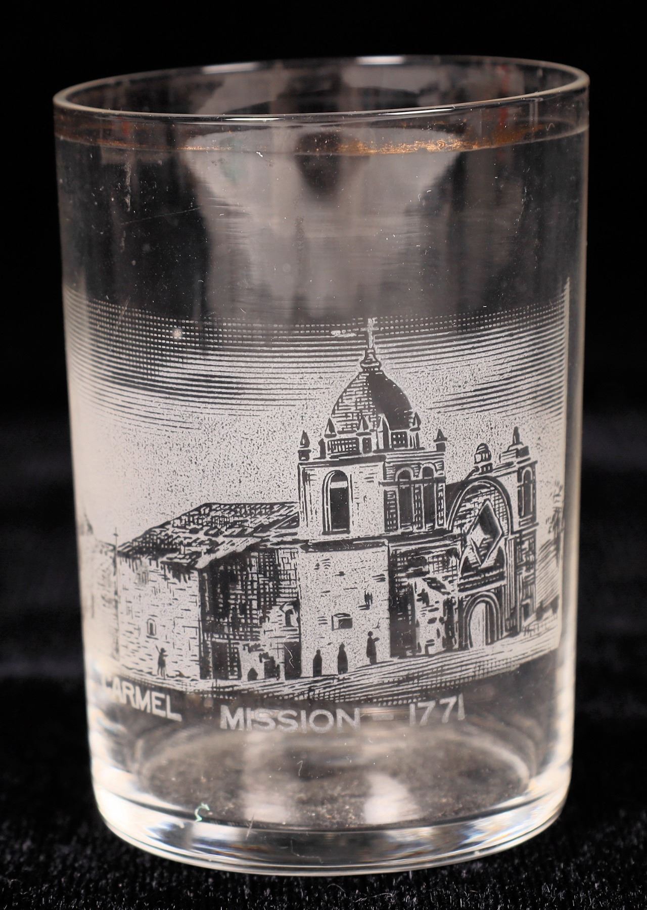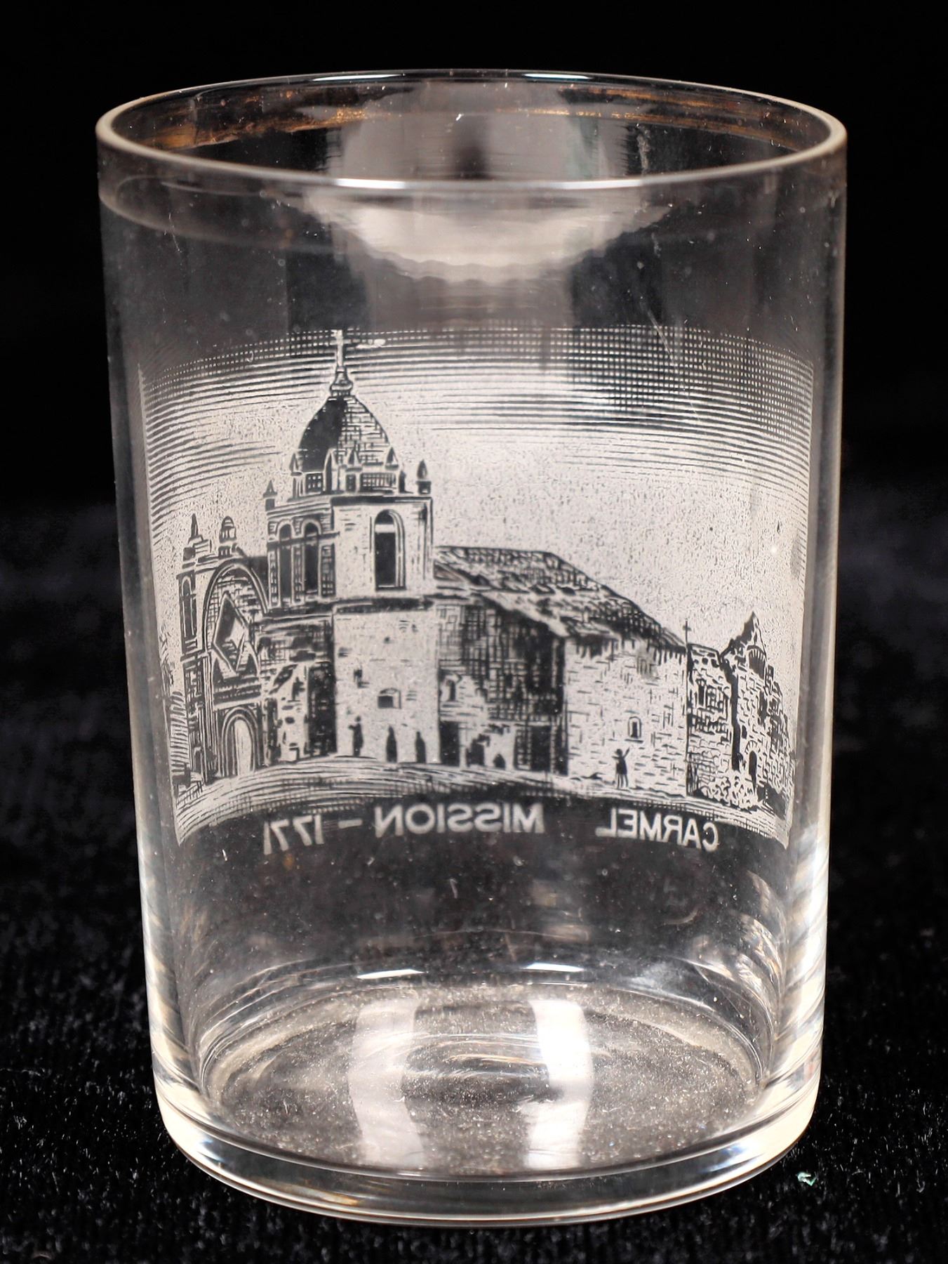 Carmel Mission-1771 glass with Mission vignette. 2.75". No apparent chips or cracks. Partial gold foil lip. California Carmel Mission