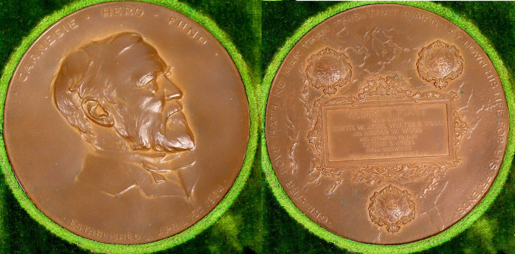 Albert E. Flatt, 18, roundhouseman, saved Curtis W. Ayers, 9; Walter E. Todd, 10, and Arnold W. Wood, 10, and attempted to save Nathan B. Ayers, 11, from drowning, Port Morris, New Jersey, December 6, 1905. Flatt broke through the ice on Lake Musconetcong while going toward the boys, who were in the water. He broke the intervening ice with his fists and succeeded, after being in the water 15 minutes, in getting all but one upon the ice. For this heroic act, he was awarded the Carnegie Medal and $1000, which he used to buy his mother a house. The 75 mm medal comes in the presentation case and includes the unfortunate newspaper clipping reporting Flatt's death a few years later when he was run over by his own train. Obverse: Carnegie Hero Fund / Established April 15th 1904 / (bust of Carnegie); reverse: Greater Love Hath No Man Than This. That A Man Lay Down His Life For His Friends / Awarded To / Albert Flatt / Who Saved / Curtis W. Ayers, Walter E. Todd / and Arnold W. Wood / and attempted to save / Nathan W. Ayers / from drowning / Port Morris, N. J. / December 6, 1905. One of the earliest medals awarded.