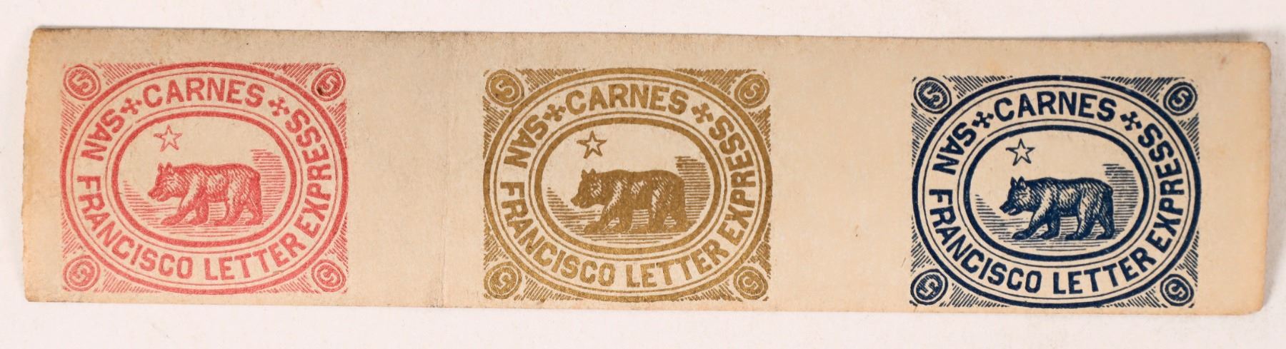 Carnes San Francisco Letter Express Locals, rare, strip of three: red (Scott #35L8), gold (Scott #35L4), blue (Scott#35L7). Original gum, extra fine. Created by former post office clerk George A. Carnes in the spring of 1864, this local post served the city of San Francisco.