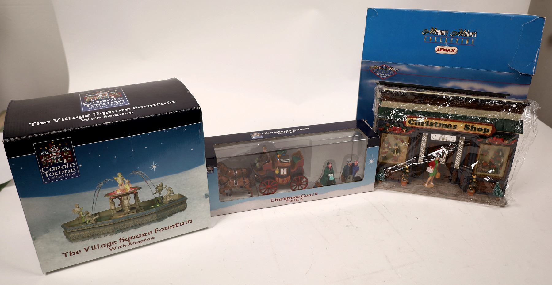 Lot of 3. All appear NIB All hand painted 1. Christmas Coach, Three figures: Horse Drawn Coach, woman w/ bags and a man holding a baby.. 2. The Village Square Fountain. Operating fountain that Includes water pump, power adapter, water resistant place mat. 3. The Christmas Shop. Detailed with windows displays, lighted, wreath on door.