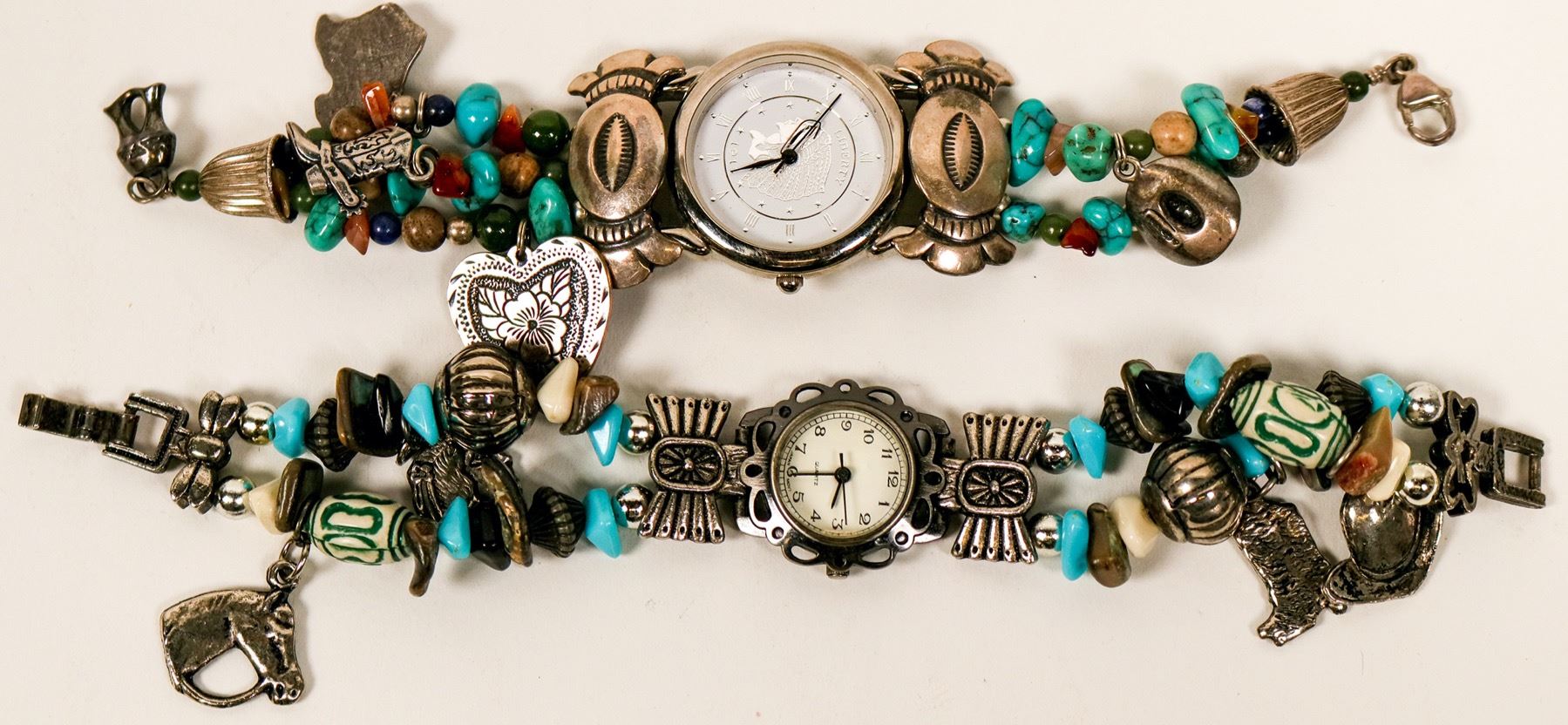 Lot of two agate and turquoise quartz watches, made in Japan, c1980s. Includes a Carolyn Pollack Southwest Traditions - D. Yazzie Native American sterling silver and stainless steel quartz wristwatch, Model GMP100. Carolyn Pollack is a designer of American South Western style jewelry. Has a liberty coin replica face dated 1911, with sterling charms including the State of Texas, and agate and turquoise beads. The second wristwatch is unmarked, quartz with "Japan movement," southwest charms and natural and manmade beads.