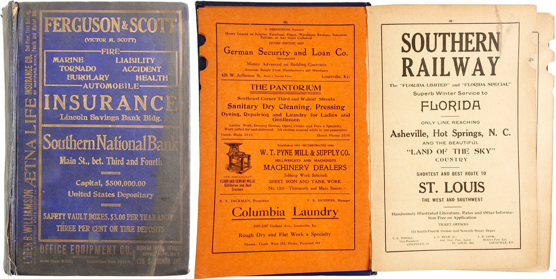 Split at center and front inside cover, dark blue binding, rare great information on Louisville distilleries.