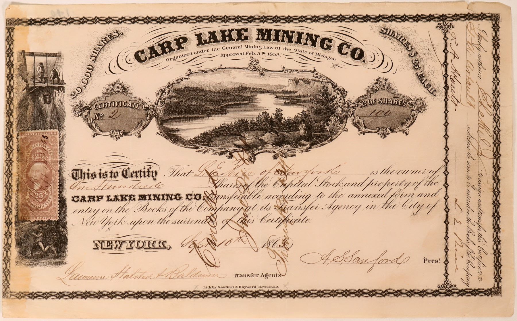 Nice vignette of a lake, presumably Carp Lake at center and miners lowering a bucket to others down the shaft at left. 25 cent revenue stamp at left. "The company's property is in the County of Ontonagon,and includes over 900 acres of land, most of which is well-timbered, and of the best quality for agriculture. It is upon the celebrated Porcupine Ridge of trap-rock, which, at the mine, is nearly 1,000 feet high, and extends parallel with the shore of Lake Superior. The northern slope is gradual, but to the south it descends precipitously to Carp Lake.Five or six veins have been traced running parallel, and dipping with the rocks. The vein is said to vary from two to four, and six feet in width, and to bear numerous masses and sheets of native copper, and considerable quantities of rich stamp work. The copper is chiefly found in one foot of the lower part of the vein, which is so soft as to be very easily and cheaply worked. The hanging wall is a dark gray trap, like that of the Minnesota mine. The average of the ore is said to yield 10 per cent, of ingot copper. Native silver, in minute particles, has recently been reported" (The Mining Magazine and Journal of Geology,1860). Extra fold lines and slight browning. Uncancelled.