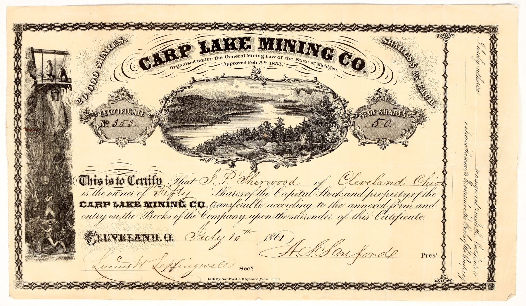 Organized in Michigan, approved in 1853. No. 353, issued to JP Sherwood in 1861. Signed by president Sanford and secretary LeHingwell. Not cancelled. Nice vignette of a lake, presumably Carp Lake at center and miners lowering a bucket to others down the shaft at left. Folds, many creases. "The company's property is in the County of Ontonagon, and includes over 900 acres of land, most of which is well-timbered, and of the best quality for agriculture. It is upon the celebrated Porcupine Ridge of trap-rock, which, at the mine, is nearly 1,000 feet high, and extends parallel with the shore of Lake Superior. The northern slope is gradual, but to the south it descends precipitously to Carp Lake. Five or six veins have been traced running parallel, and dipping with the rocks. The vein is said to vary from two to four, and six feet in width, and to bear numerous masses and sheets of native copper, and considerable quantities of rich stamp work. The copper is chiefly found in one foot of the lower part of the vein, which is so soft as to be very easily and cheaply worked. The hanging wall is a dark gray trap, like that of the Minnesota mine. The average of the ore is said to yield 10 per cent, of ingot copper. Native silver, in minute particles, has recently been reported" (The Mining Magazine and Journal of Geology,1860). (Degood pg. 77)