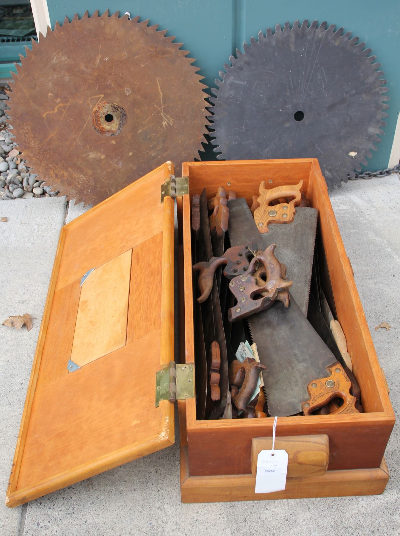 This carpenter's tool chest of hand saws includes 30 hand saws some with names of Rosecrans of San Francisco and H. Disston Co. There are 4 loose handles, 2 loose blades. and 28 complete vintage saws. There are also two circular saw blades; one at 24 in. in diameter, and one at 26 in. in diameter. The price includes the chest. Please consider additional shipping charges; a local pick up is preferred.