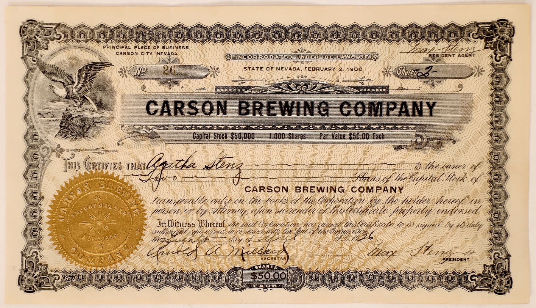 Issued 1926 Carson Brewing stock. Carson City Nevada Ken Prag Collection