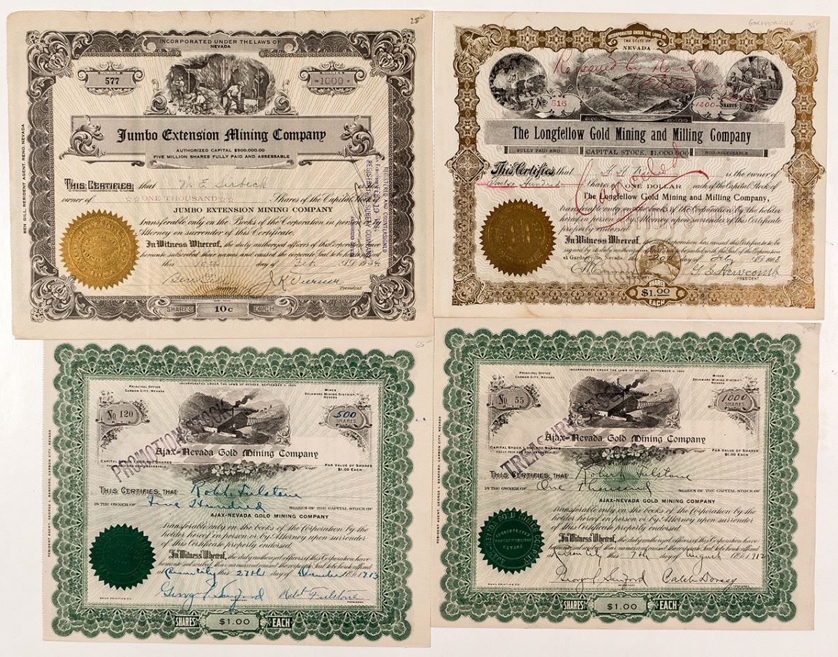 1) The Longfellow Gold Mining and Milling Company, 1908, cancelled; 2) Jumbo Extension Mining Company, 1934; 3) Ajax-Nevada Gold Mining Company, 1912, Treasury Stock; 4) Ajax-Nevada Gold Mining Company, 1913, Promotion Stock. (Prag Collection) City: Carson City State: Nevada Date: hwac# 31536