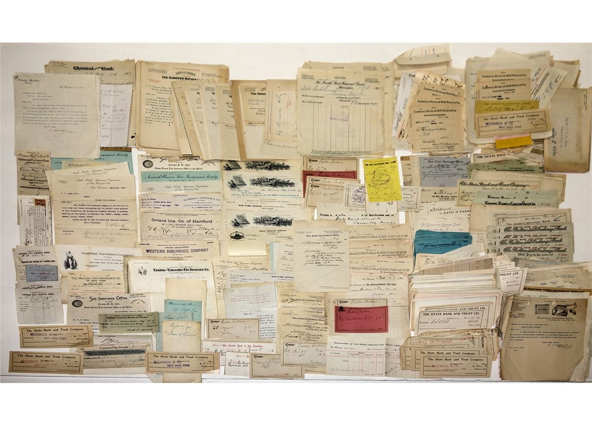 This box is full of many different types of documents that span the history of the Bullion & Exchange Bank (and later, the State Bank & Trust Co.). Find Memorandums of Gold Bullion deposited with Selby Smelting & Lead Co. for Refining (1898-1900), many letters between banking interests in San Francisco and Carson (including from H.M. Gorham, who was once supt. of Comstock mines), debit slips, bullion and coin purchases, checks, balance sheets, insurance forms, and many other types of banking forms, incl. those involving noted financial figure and Mint superintendent T.R. Hofer. This archive deserves a close inspection! 500+ documents.