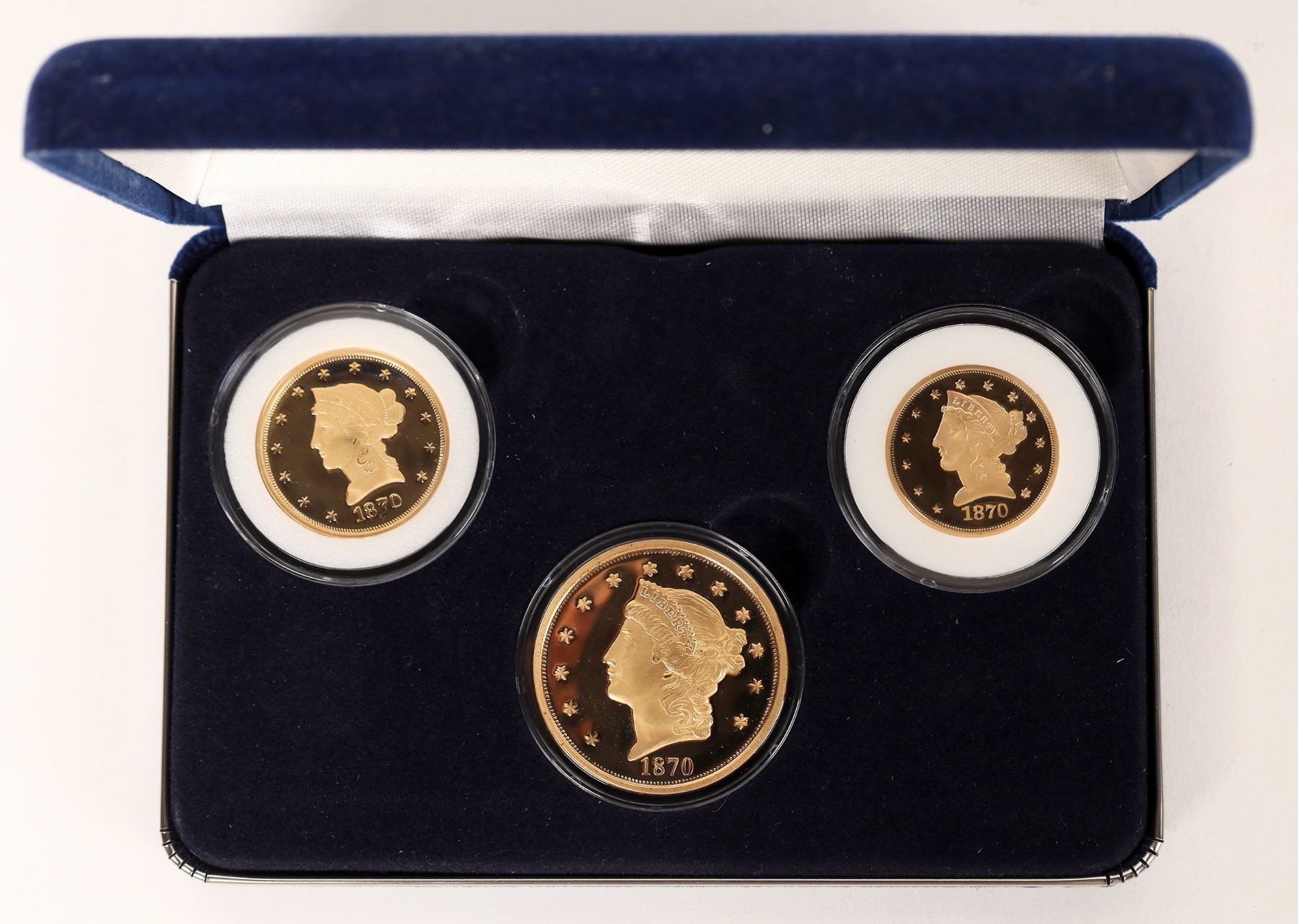 Issued by the National Collector's Mint, the certificate of authenticity is signed by Barry M. Goldwater Junior. Housed in blue velvet case: three privately minted, non-monetary proofs each struck for National Collector's Mint as collector's desired proof specimens. All three gold layered clad bronze pieces are dated 1870, and have the "CC" mint mark, and are marked "copy". $5, $10 & $20 sizes.