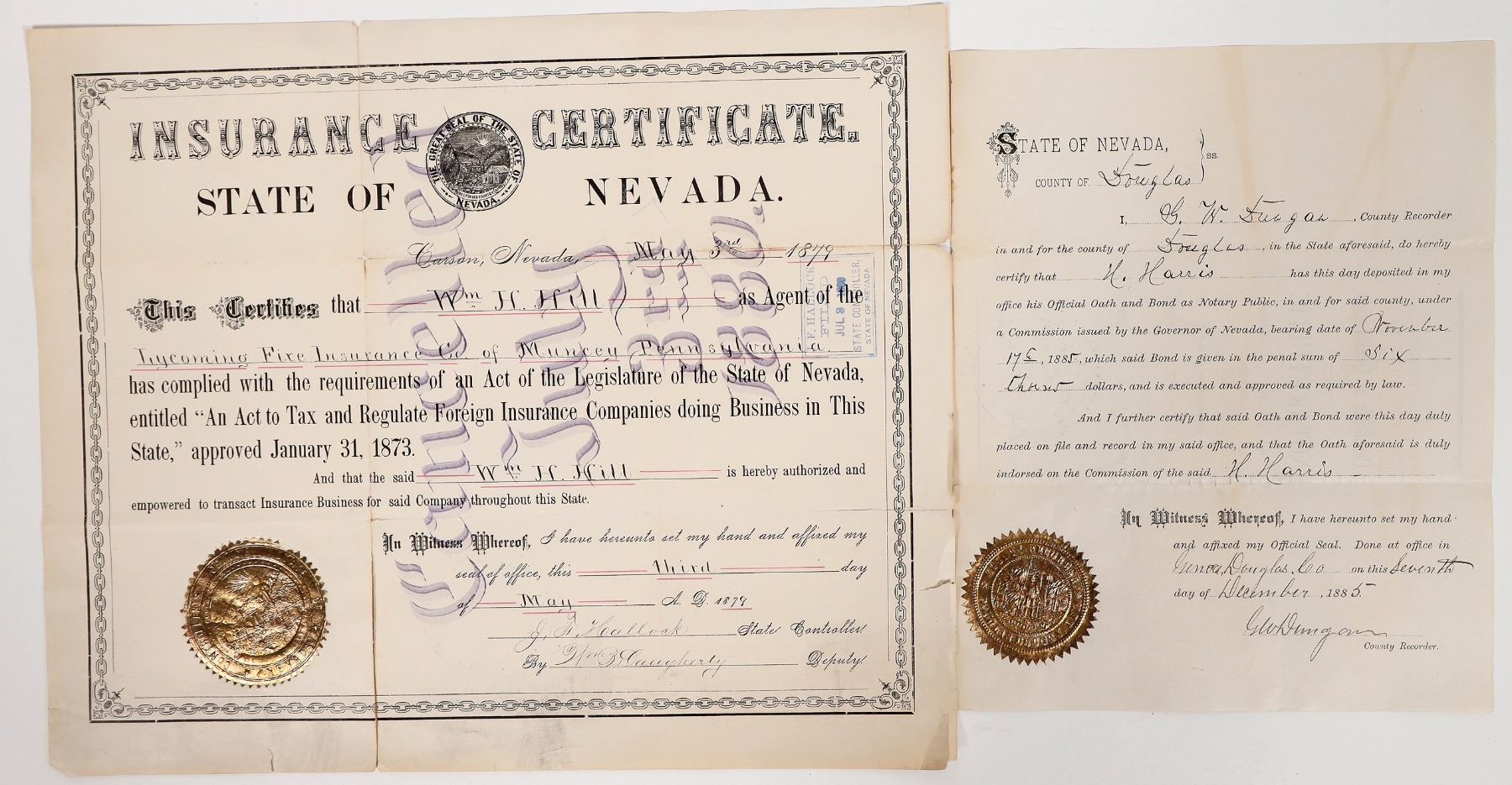 A pair of antique legal documents from Carson City, Nevada, dated 1879 and 1885. Lot includes an 1879 insurance certificate made out to William H. Hill from the State of Nevada, cancelled, embossed gold state seal, signed by deputy and state controller. Also includes an 1885 notary's bond receipt from Douglas County, embossed gold seal, signed by county recorder. Significant crease tearing on insurance cert, some foxing on notary receipt.