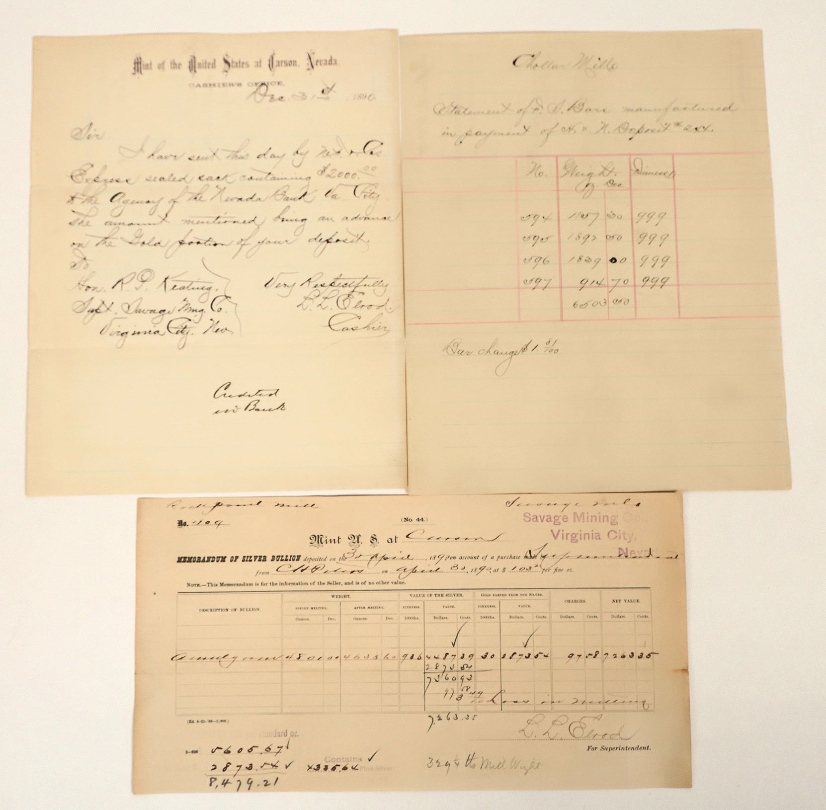 Lot of 3 different. 1) Official printed letterhead for deposit by the Savage Mine. Cashier Elrod is sending $2,000 by Wells Fargo stage to the Nevada Bank of SF in Virginia City. Likely in gold coin. 2) Printed Carson City Mint document with notations for silver bars made for a deposit by the Hale & Norcross Mine from the Chollar Mill. No date, but form is 1880s. 3) 1890 Memorandum of Silver Bullion deposited by the Savage Mine. Amalgam weighing 4,801 ounces . Signed by LL Elrod for supt.