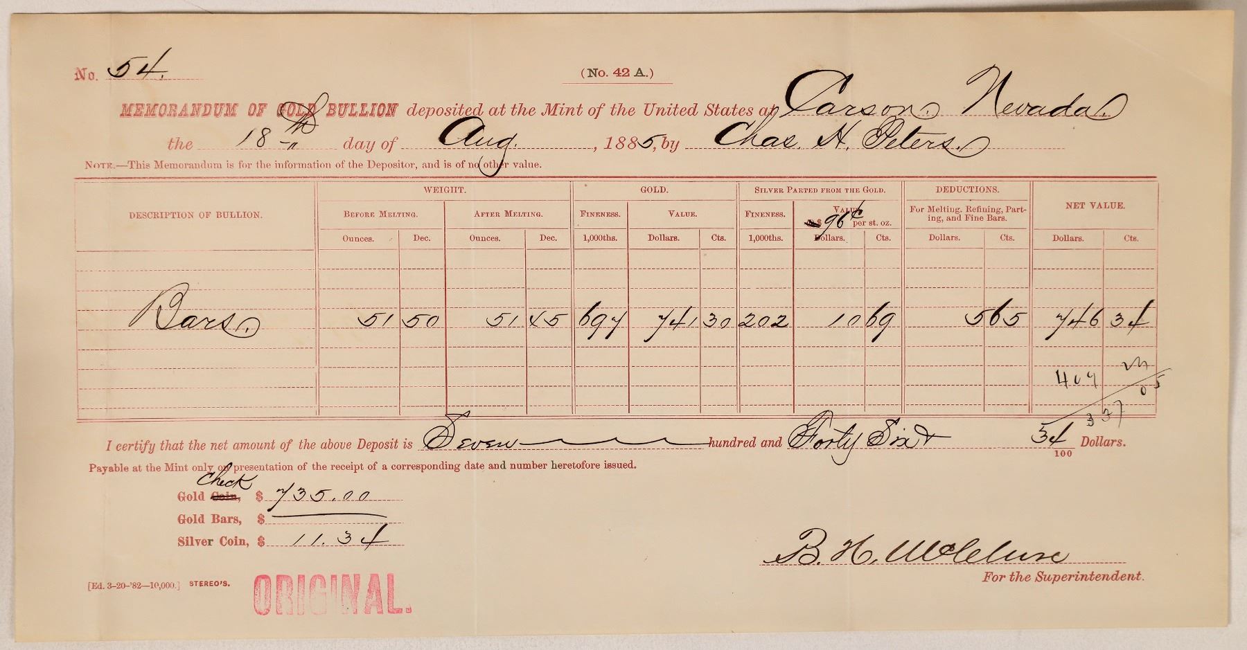Memorandum of Gold Bullion deposited at the Mint of the United States at Carson, Nevada the 18th day of August, 1885, by Chas. H. Peters. (Peters was an insurance agent in Carson City). Deposit is 51.50 ounces, .697 fineness in gold, valued at $746.34. Signed by BH McClure for the Superintendent. Payment was $735 in gold check, $11.34 in silver coin. At this time (1885), the Carson City Mint was not producing coins. The mint was shut down in 1885 for political reasons and remained closed under a Democratic administration led by President Grover Cleveland from the middle of 1885 until the fall of 1889. In October 1889, coins once again began rolling off the mint's presses and continued to do so until the spring of 1893, at which time coinage operations ceased for good. 6 x 11.25" Folds.