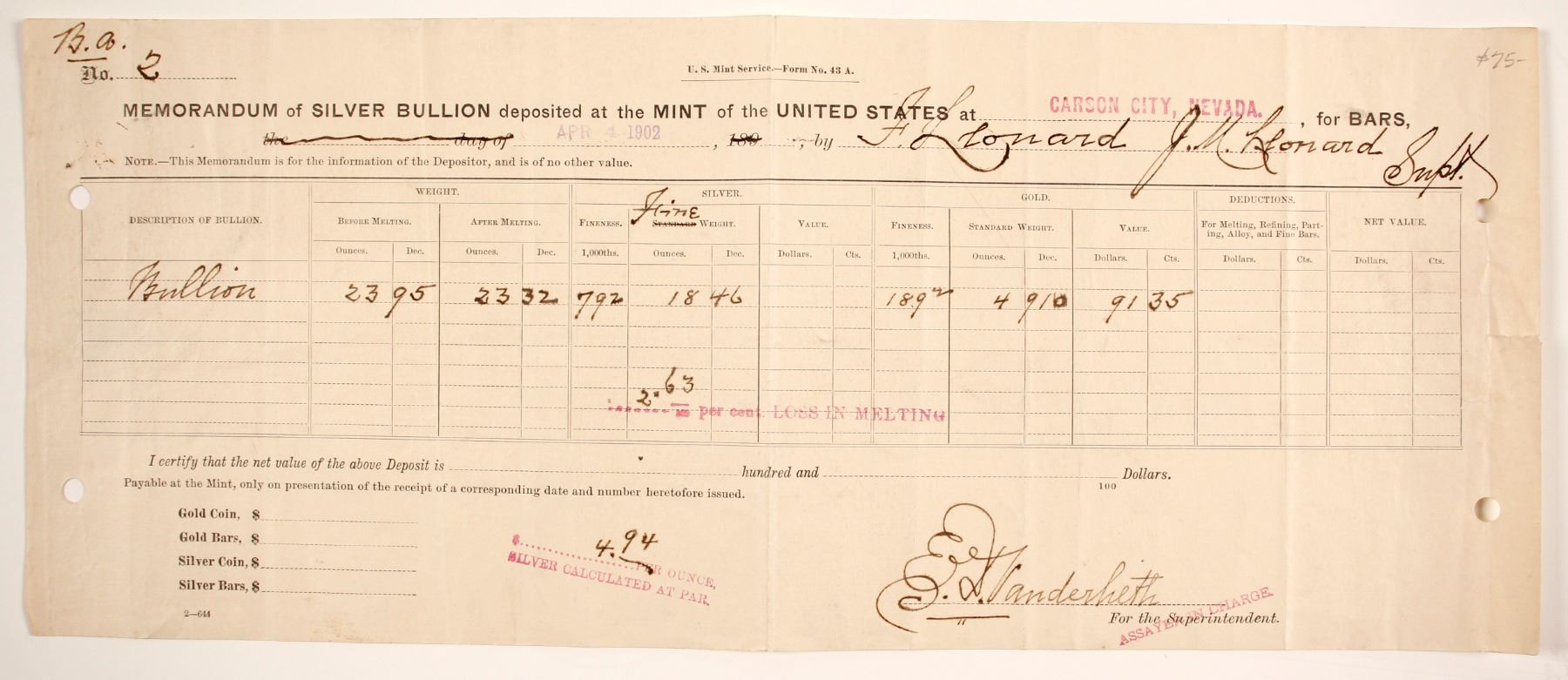 Memo. of Silver Bullion deposited at the Mint of the U.S. at Carson City, Nevada. BA No. 2. "Before Melting, 23.95" "after melting 23.32" Signed by E.J. Vanderheth(?)