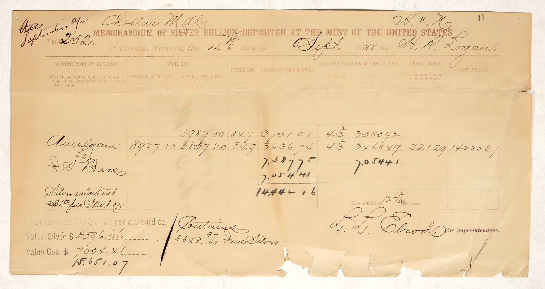 Memorandum of Silver Bullion Deposited at the Carson City Mint on Sept. 4th, 1888 by HR Logan. Marked "Chollar Mill" at upper left and "H&N" upper right (for Hale & Norcross). Huge deposit of amalgam (8927 ounces) made into two huge bars each about 4000 ounces! Signed by LL Elrod for superintendent. Heavy toning, numerous rips along the bottom right. Please see photo. 5.5 x 11"