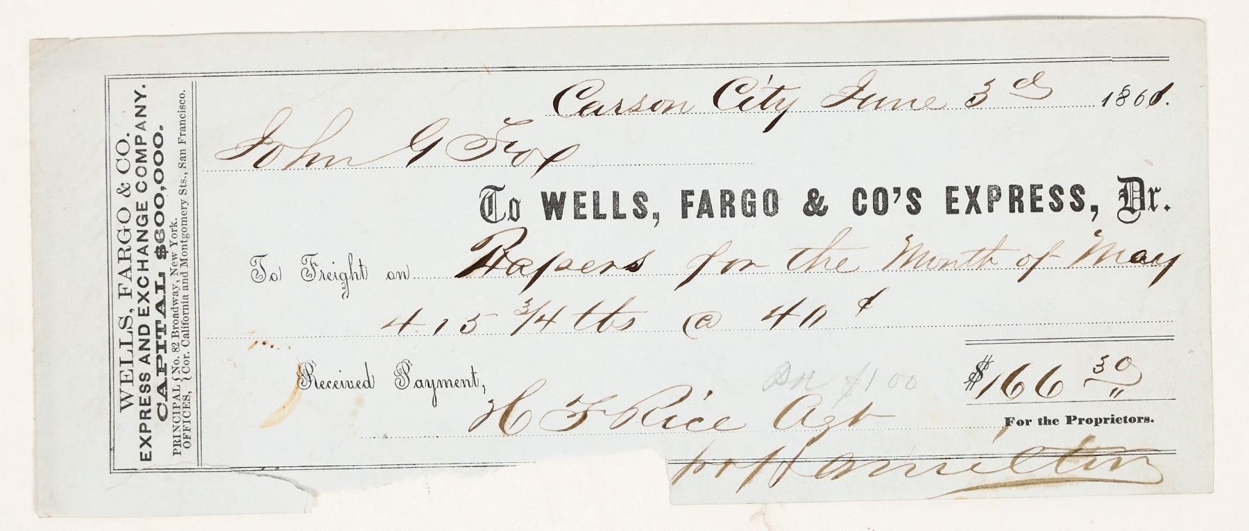 Very early Carson City! Wells, Fargo & Co. Express, Carson City, June 3rd, 1861 (a few months after Nevada Territory was created). Receipt for CC merchant John G. Fox for freight on papers. Signed by HF Rice, the WF agent right at the beginning of the office's creation. Piece torn off. 3.5 x 8.5"