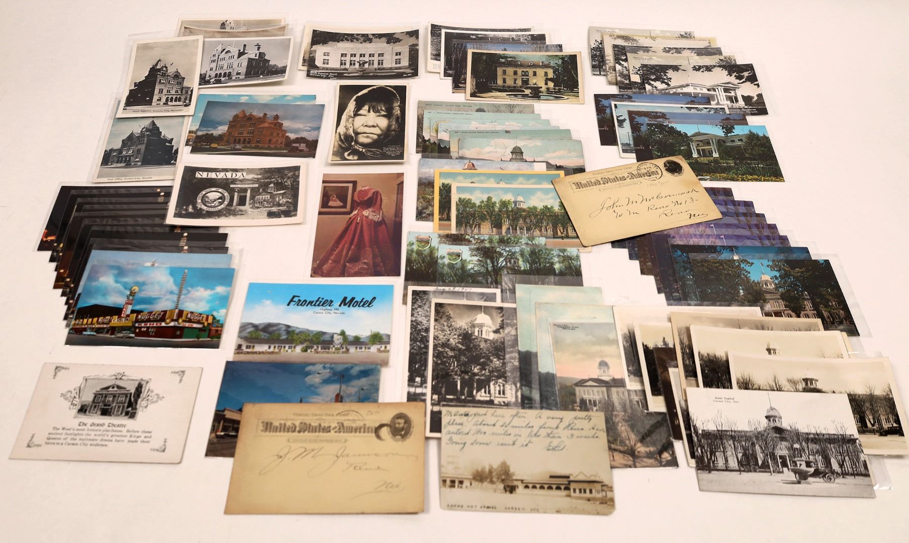 About 65 postcards showing images of the smallest state capitol in the United States, Carson City, Nevada. Cards show the capitol building, the state supreme court building, the federal building and several cards featuring the Bowers Mansion, located just a short drive out of town. Cards are colorful, historical and would be a great addition to any domestic philatelic collection. Please see photos for more detail and description.