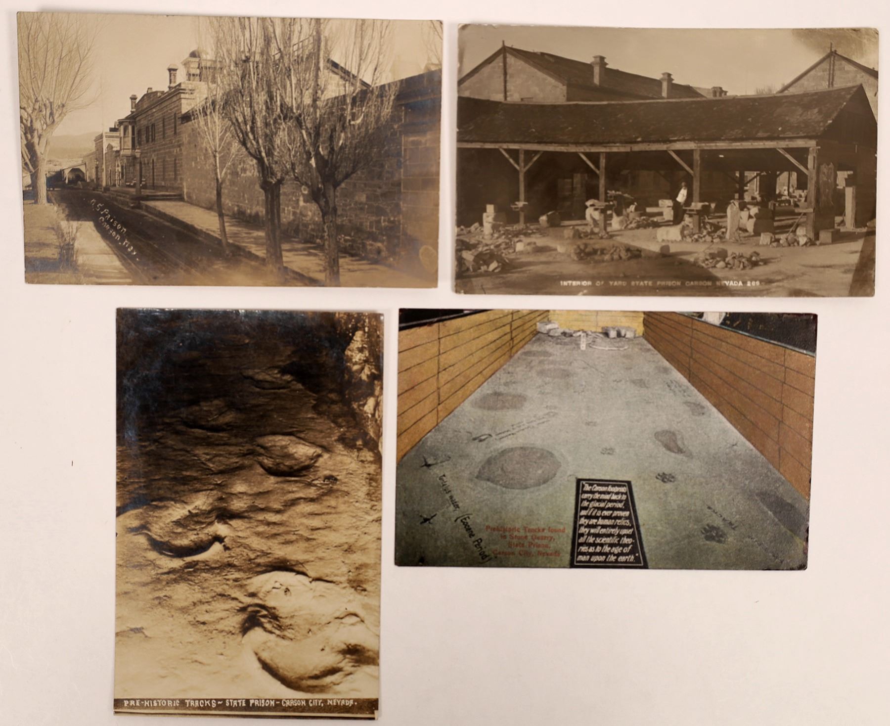 Four RPC's of photos taken at the state prison in Carson City, NV. Cards include images of prehistoric footprints found on the grounds, as well as shots of the prison in its earlier days. Three are unused. Please see photos for more detail and condition.