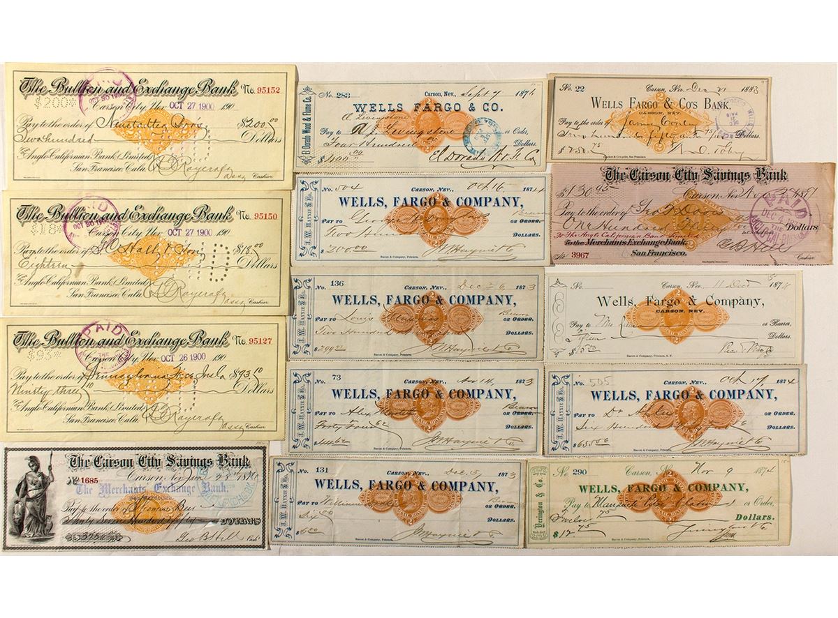 Lot of 15. Eight different. Includes: El Dorado Wood & Flume Co., Yerington & Co., J.W. Haynie & Co. Bullion and Exchange Bank, Carson City Savings Bank, and generic Wells Fargo drafts. All used. (Prag Collection)