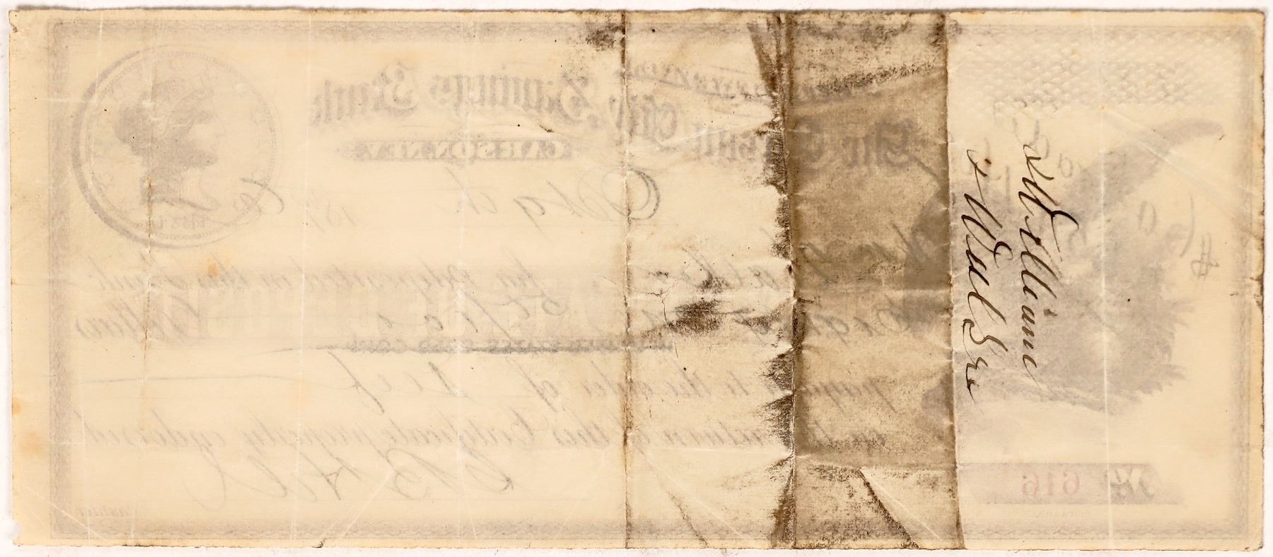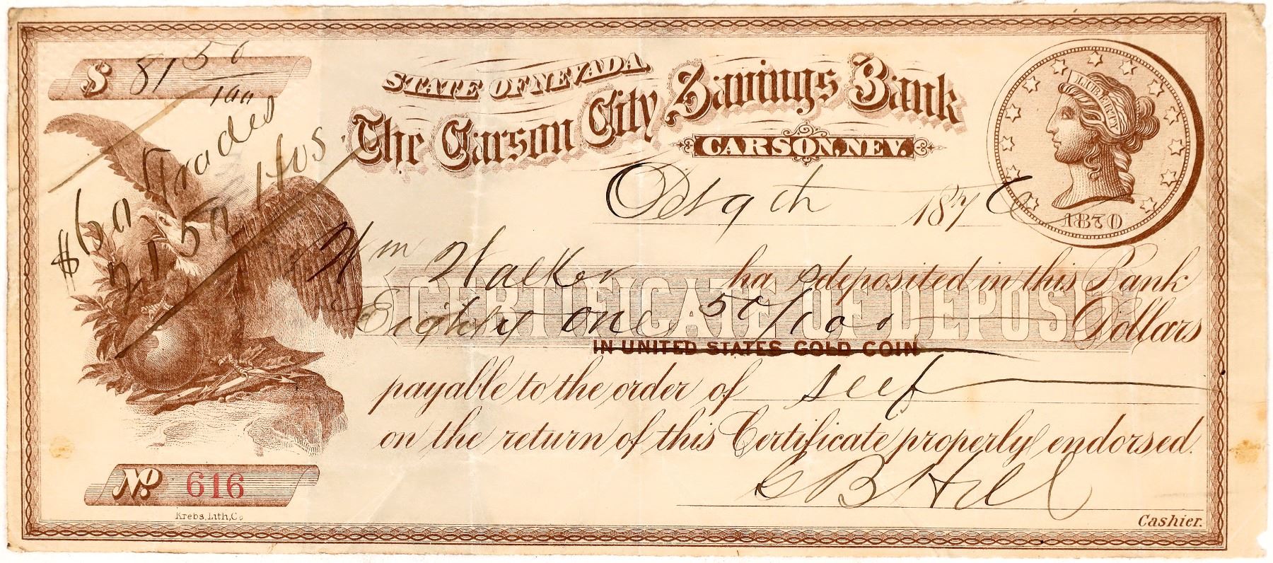 October 9th 1876 William Walker deposited $81.50 and received this certificate of deposit from the Carson City Savings Bank, with an eagle vignette at left and an 1870 Liberty Head gold piece vignette upper right. By Krebs Lithography Company. Carson City Nevada