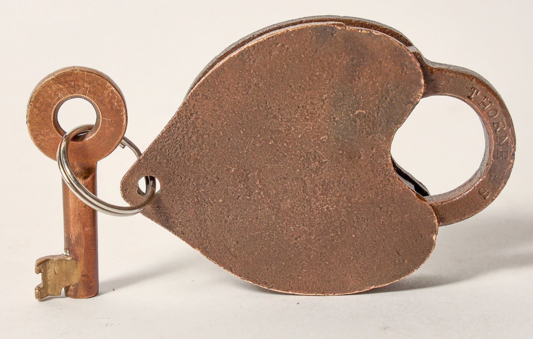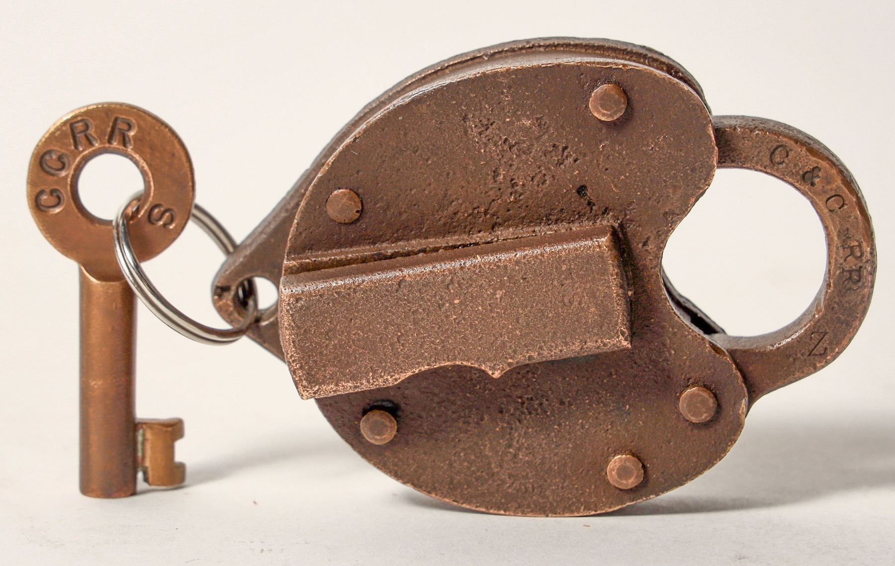 A heart-shaped Carson and Colorado Railroad lock and key, c1881-1900. "C & C RR Z" and "Thorne S" engraved on the shackle. XRARE. Probably the only one known. Thorne Station, located on the east side of Walker Lake in Esmeralda County, was utilized by the narrow gauge Carson/Colorado Railroad, starting in 1881 during the Nevada mining boom. The Carson & Colorado was incorporated in 1880 with financing backed by W.E. Sharon, one-time senator and D.O. Mills, mining magnate. "The line ultimately extended from Keeler, California to Mound House, Nevada." (Nevada State Journal, Dec. 16, 1945 - Newspapers.com) The line was taken over by the standard gauge Southern Pacific in 1900. The Thorne Depot was demolished in 1983, with some of its parts going to the Nevada State Railroad Museum in Carson City, Nev. The town of Thorne, Nevada, no longer exists. The lock measures about 3" x 2.5" x 1". Excellent condition.