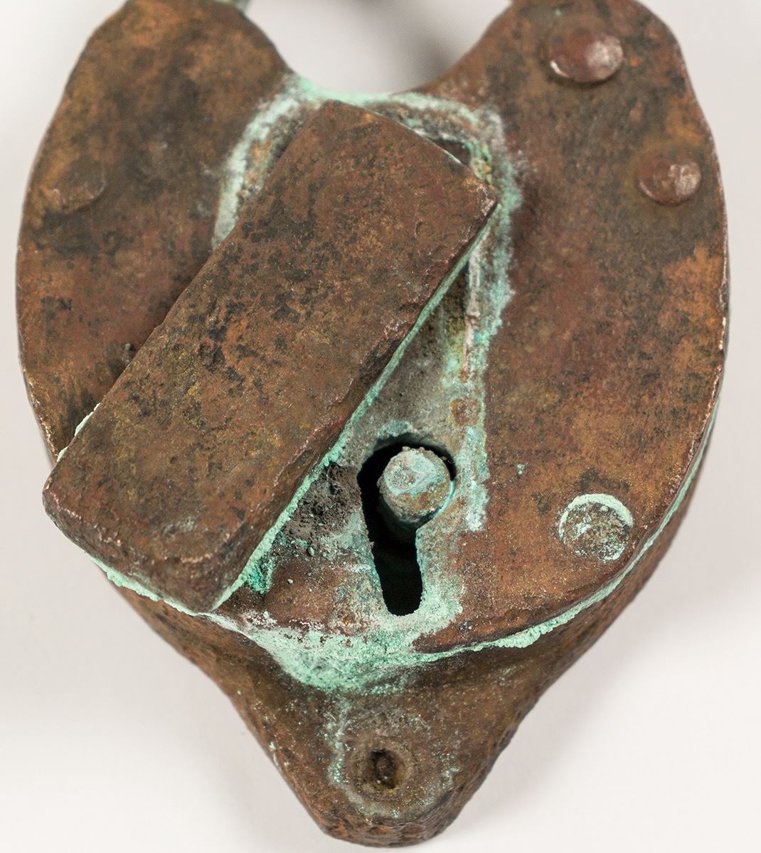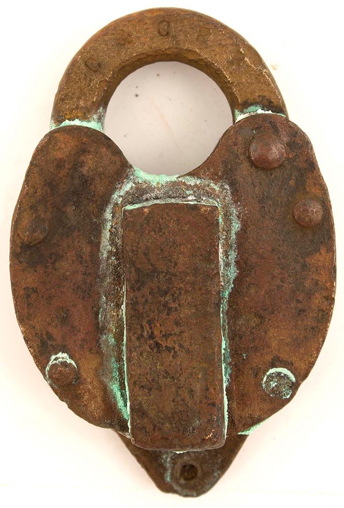 This is a padlock from the Carson & Colorado RR. Used on Cars or cabooses, this lock shows rust and is not in working order. It's still a nice historic piece Date: Location: Nevada HWAC# 56420