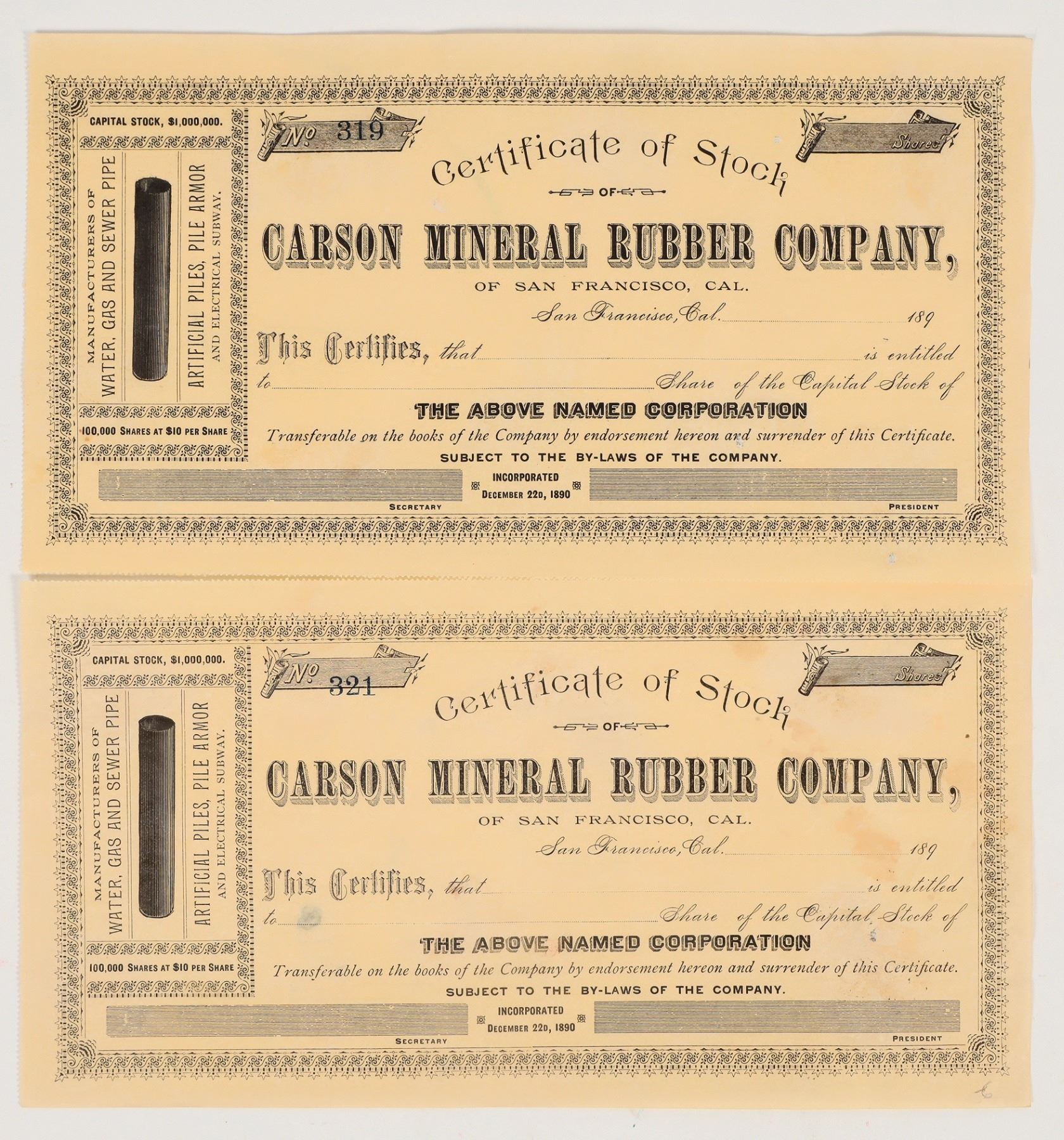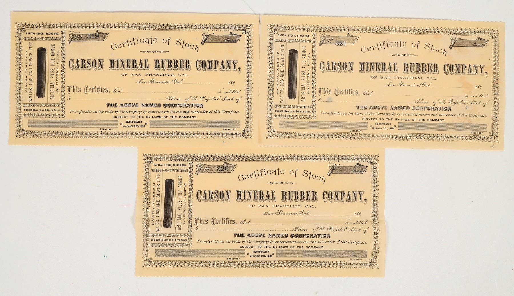 Lot of 3. U/U, Carson Mineral Rubber Co. of San Francisco, Cal. stock certificates. Dateline 189_. No vignette. Unk. printer. These are considered rare.