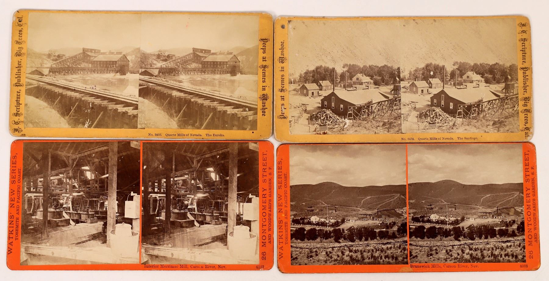 Lot of 4 different. Some of the largest Comstock mills were built along the Carson River from Empire to below Dayton. Harnessing the water for power (and access to lumber), quartz mills starting springing up in the early 1860s. This is a rare group. 1) Watkins' New Series, Yosemite and Pacific Coast, 26 Montgomery Street, and Woodward's Garden, S.F. "Brunswick Mills, Carson River, Nev. 4088" Great contrast and focus. Reverse has paper loss. c.1870s. The Brunswick Mill, constructed in 1864, was located one mile east of Empire City. The Pacific Mill & Mining Co. (owned by Mackay, Fair, Flood, O'Brien) bought it in 1875 to process Con. Virginia ore. 2) Watkins' New Series, Yosemite and Pacific Coast, 26 Montgomery Street, and Woodward's Garden, S.F. "Interior Merrimac Mill, Carson River, Nev. 4103." The "Nevada and the Comstock Series," #4066-4192, were taken from 1875-1877 by Carlton E. Watkins. View shows pans and mill equipment. Good contrast, okay focus. The Merrimac was 1/2 mile below the Brunswick and two miles below Empire City. It had an impressive dam. 3) JC Scripture, Publisher, Big Trees, Cal. "Peeps at Scenes in Washoe." "No. 3434. Quartz Mills of Nevada. The Santiago." Rare view shows large pile of wood next to buildings. Light contrast, medium focus. Some scuff marks. Stamped on the reverse for VC bookseller Fred Boegle. Punch hole upper left. The Santiago Mill was located between the Vivian and Eureka Mills three miles east of Empire City. Built by William M. Stewart. 4) JC Scripture, Publisher, Big Trees, Cal. "Peeps at Scenes in Washoe." "No. 3435. Quartz Mills of Nevada. The Eureka." Great view of the mill and water with track in foreground. Medium contrast, sharp focus. Stamped on the reverse for VC bookseller Fred Boegle. Punch hole upper left. The Eureka was one of the largest mills on the Carson River, located approx. 3 miles above Dayton. Taken over by the Union Mill & Mining Co. (William Sharon) in 1871. Virginia City Nevada Franklin Collection