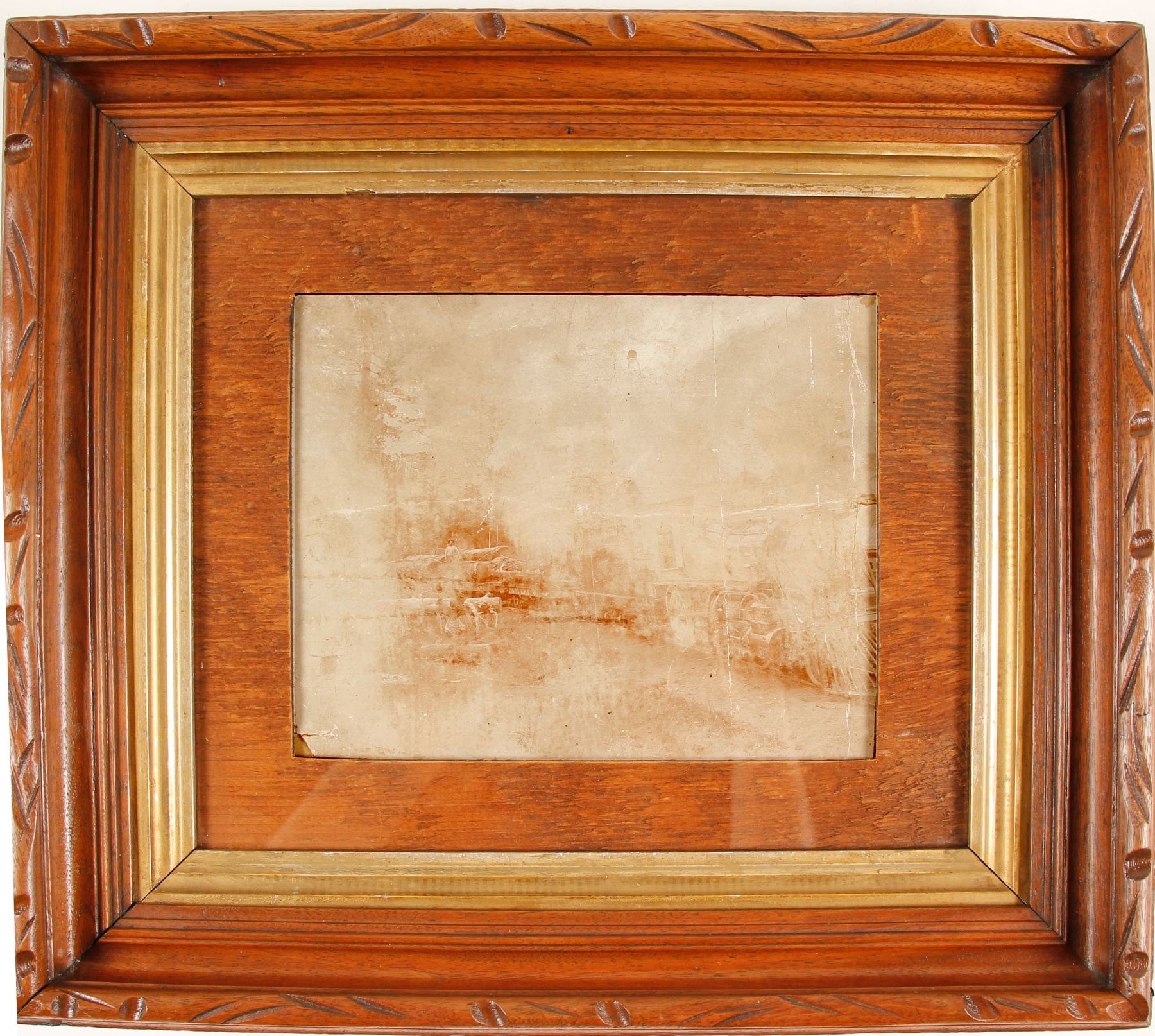 Photo of the Carson and Tahoe Lumber & Fluming Company's narrow gauge 2-6-0, no.3. Photo taken near Bijou, California at the J. H. Martin Camp at the southern end of Lake Tahoe. The Baldwin Locomotive Works built this model in 1877. The engine was sold to the Lake Tahoe Railway & Transportation Company in 1899. Photo is very faded, 8.5" x 7". Nicely framed, 13.5" x 16.5".