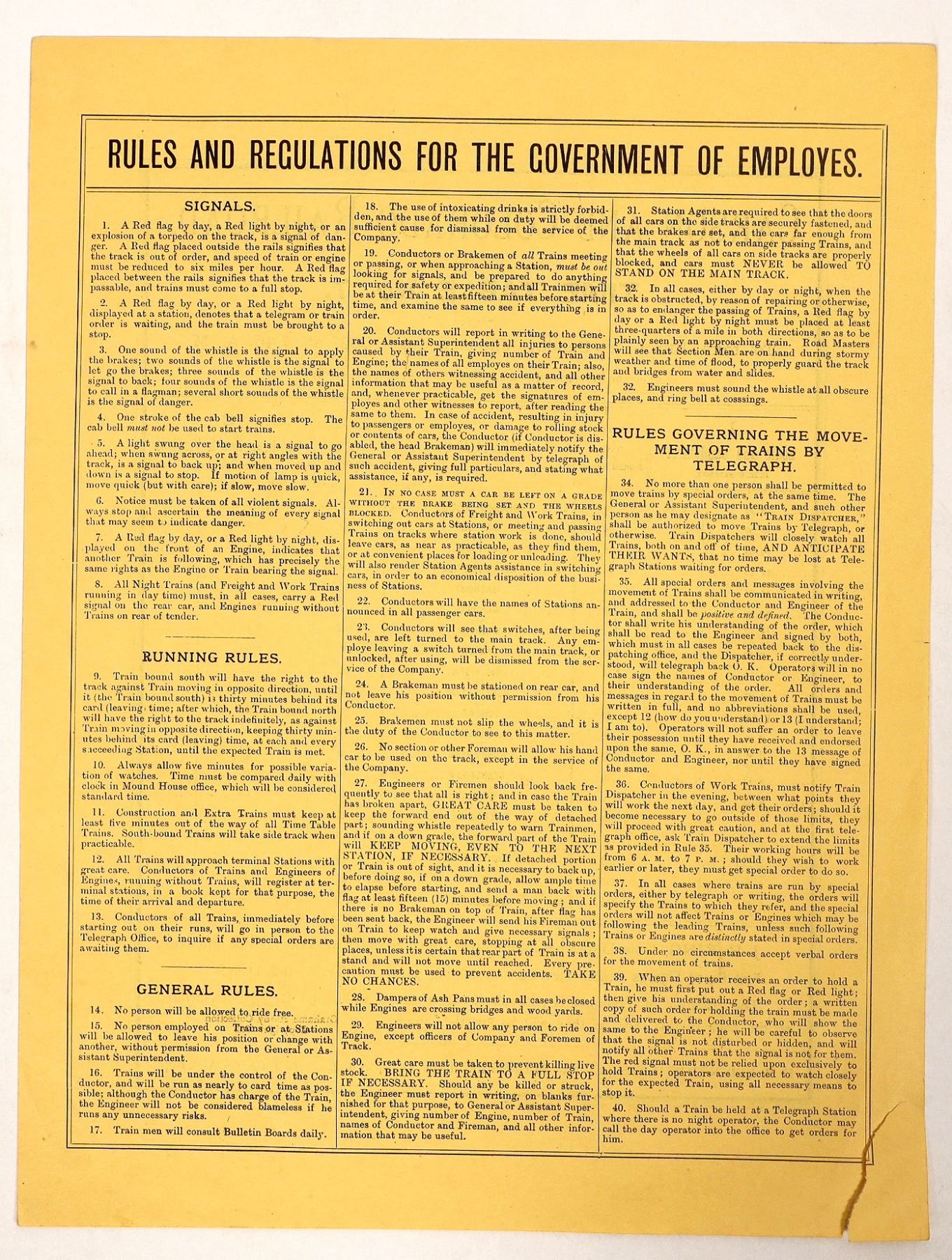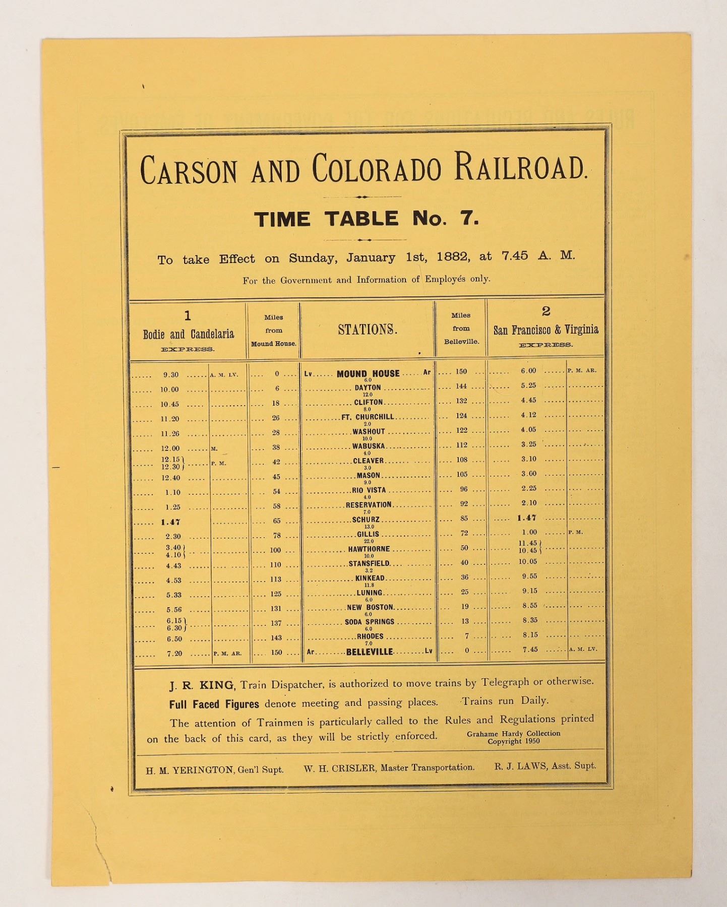 c. 1960's Graham Hardy reprint of a 1882 Carson and Colorado Railroad timetable and employes(sic) rules and regulations on verso. 12.5x9.5". 1.5" lower left tear. Please inspect.