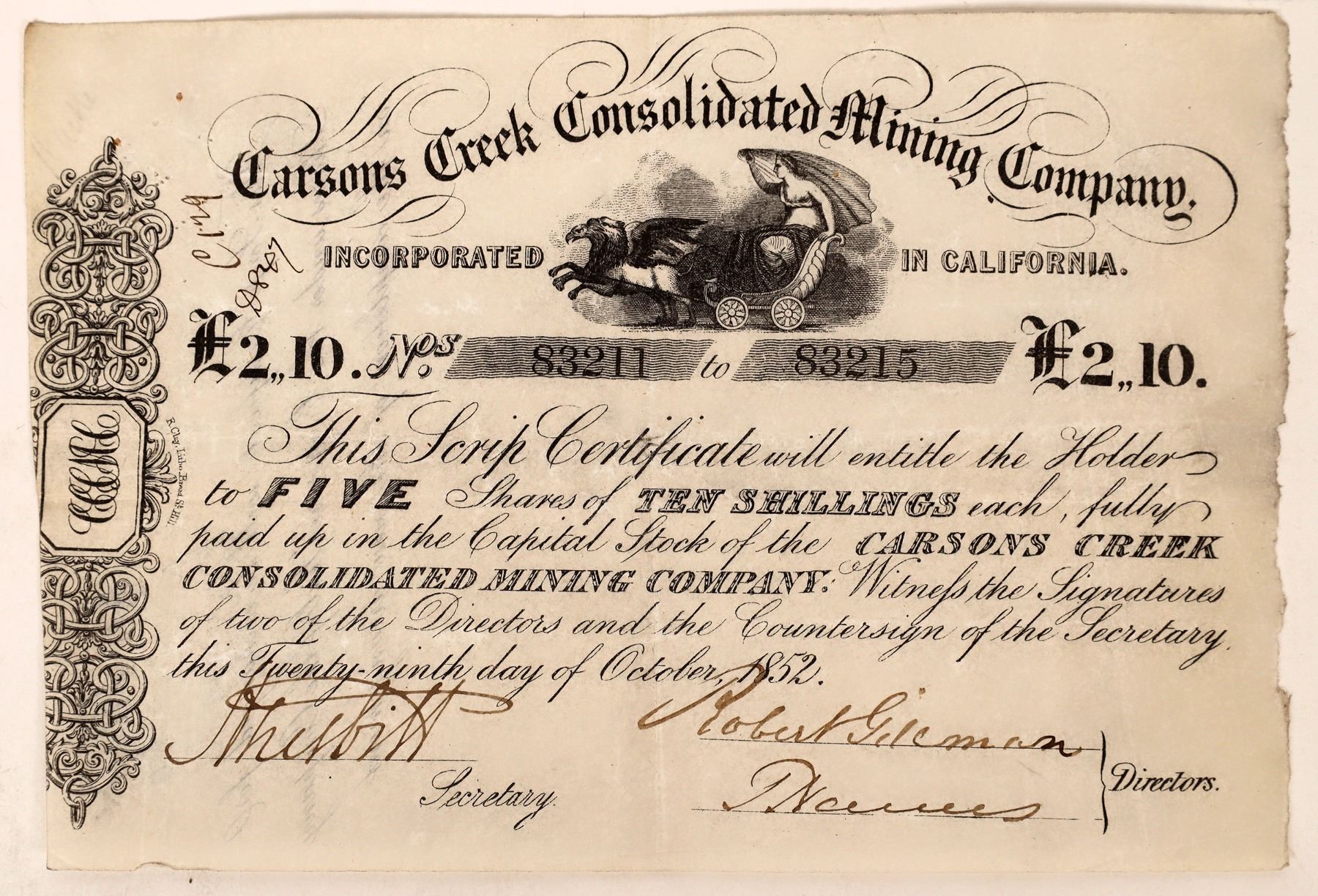 Early California Gold Rush scrip certificate/stock. Issued 1852, 5 shares of 10 Shillings each. Allegorical vignette. Signed by 2 directors and secretary. Mine in Calaveras County and was considered the richest gold deposit in California at the time. Multiple creases and pin holes. Please inspect. California