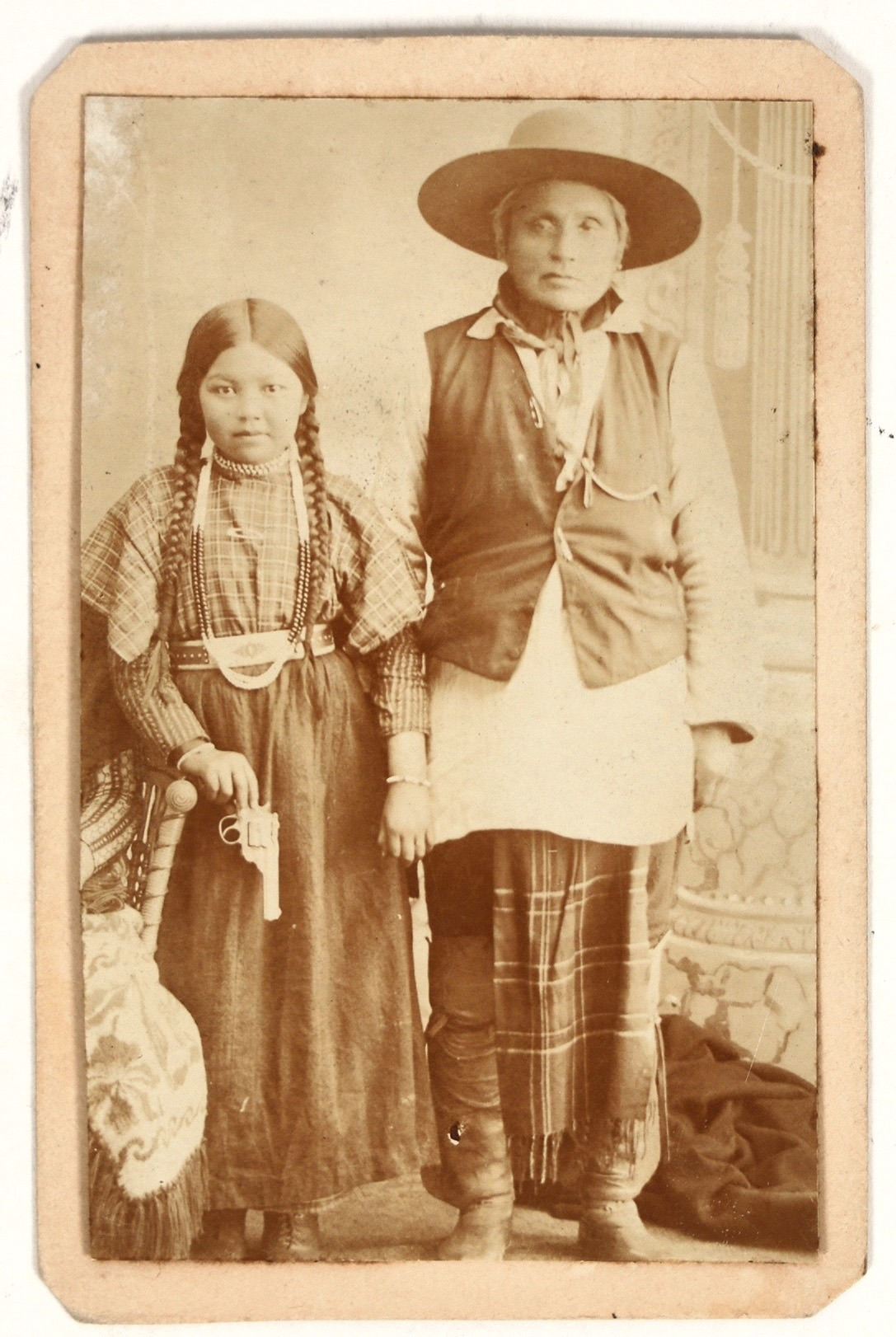This is a CdV photo of a Bannock Shoshone man with a young girl holding a pistol. The revolver is a Hopkins and Allen break-top revolver. Clearly a staged studio photo where the girl holds the gun with a complete lack of alacrity. The photo is thought to have been taken near Fort Hall, Idaho. Please see photo for details. Good contrast at 2.35 in. X 3.5 in.