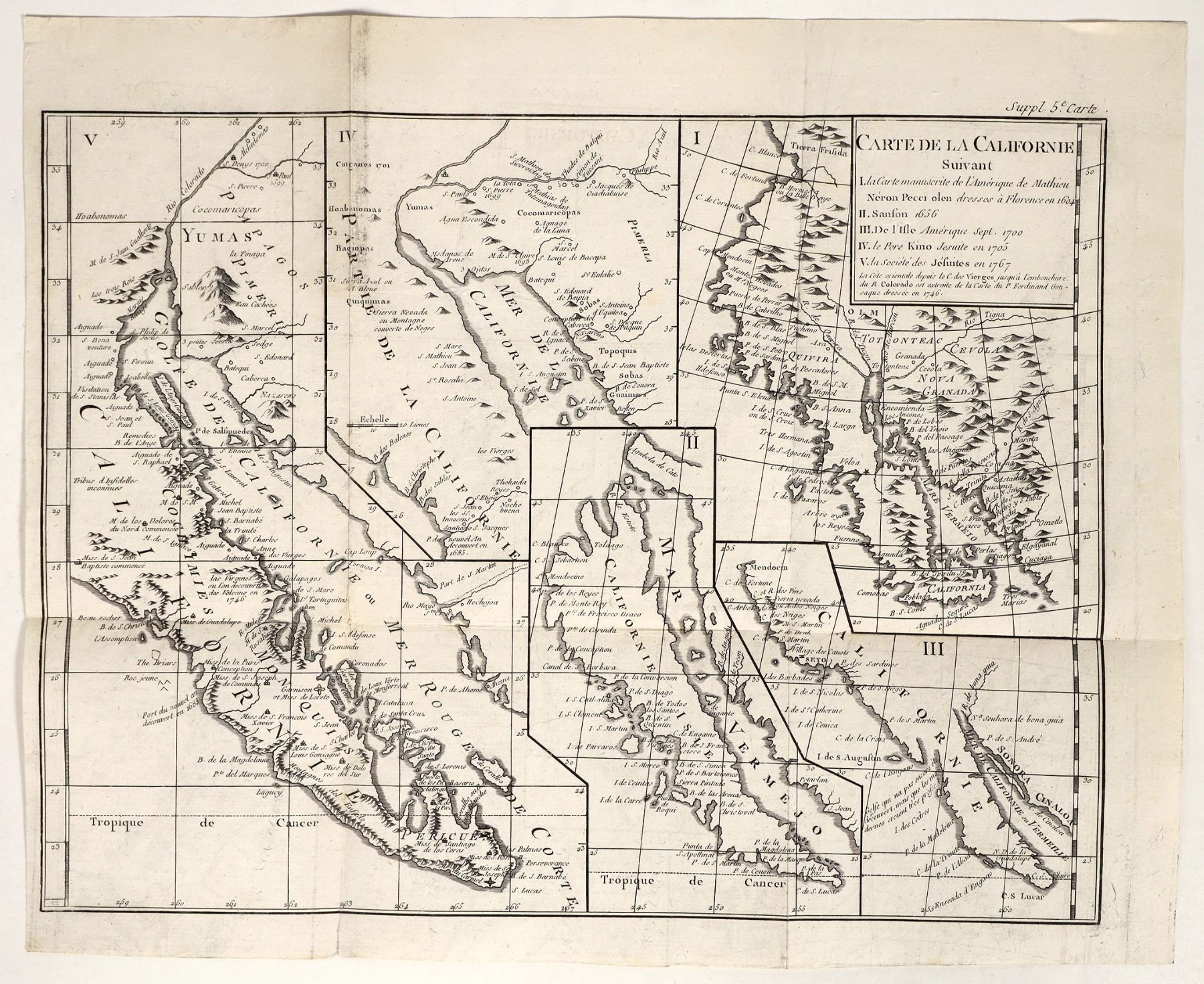 Rare. Includes five representations of how California was mapped, 1604-1767. Approx. 14 x 16.5" Published in Denis Diderot's "Encyclopedie", Paris, 1772. This shows the evolution of how California was mapped from the 1604 map of Mathieu Neron Pecci . Also includes: the Nicholas Sanson map of California as an Island and Father Eusebio Kino's map (which dispelled the myth of California as an island). Historically important!
