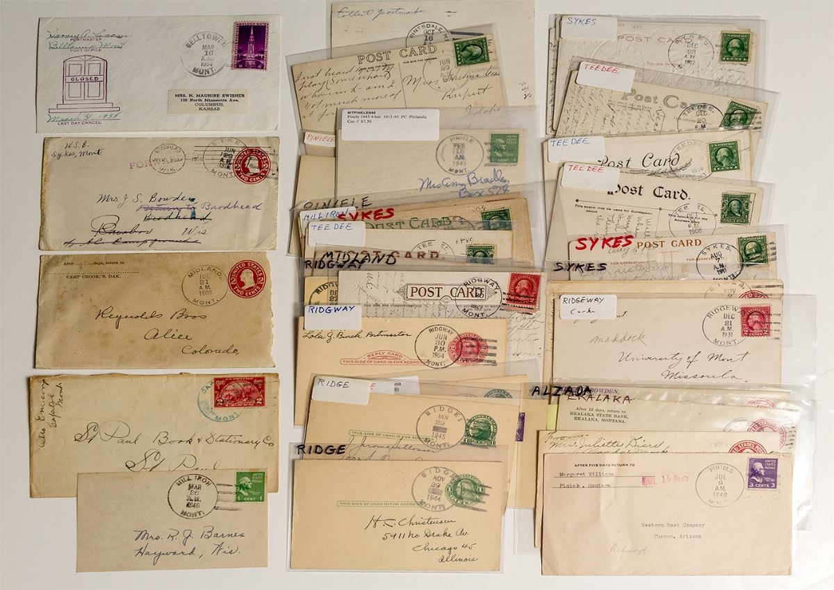 34 Total pieces from Carter Co. MT that include Belltower last day pictorial, Piniele, Alzada, Ekalaka, Capitol with a turquoise cancel, Sykes, Ridgeway, Midland, Mill Iron, TeeDee, and Pinesdale cancels. City: State: Montana Date: Inventory# 38708
