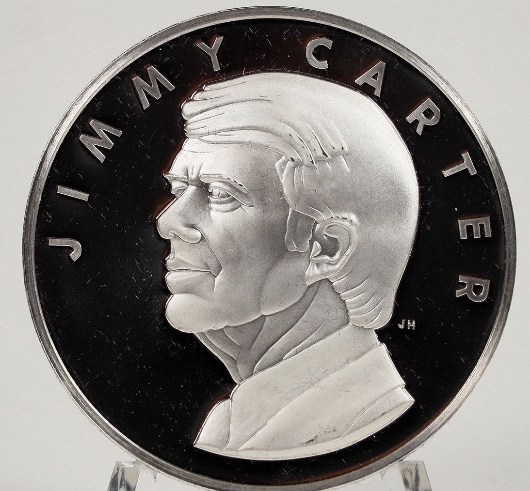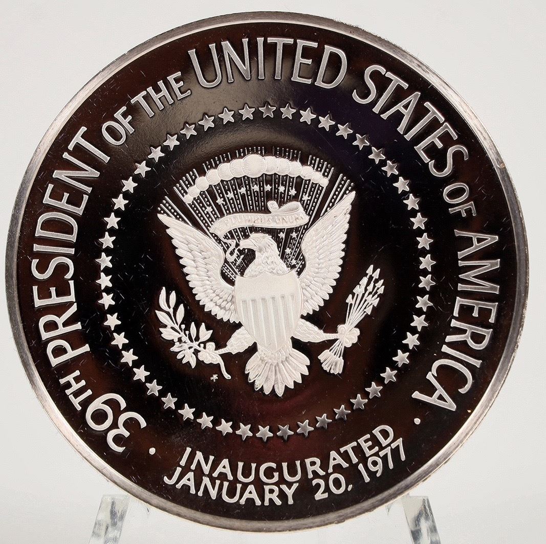 Carter Presidential Inaugural Medal 1977 with Certificate of Authenticity. The Official 1977 Presidential Inaugural Medal. Hallmarked, serially numbered PROOF minted in .999 FINE SILVER by the Franklin Mint. Limited edition #5265. 198.2 grams