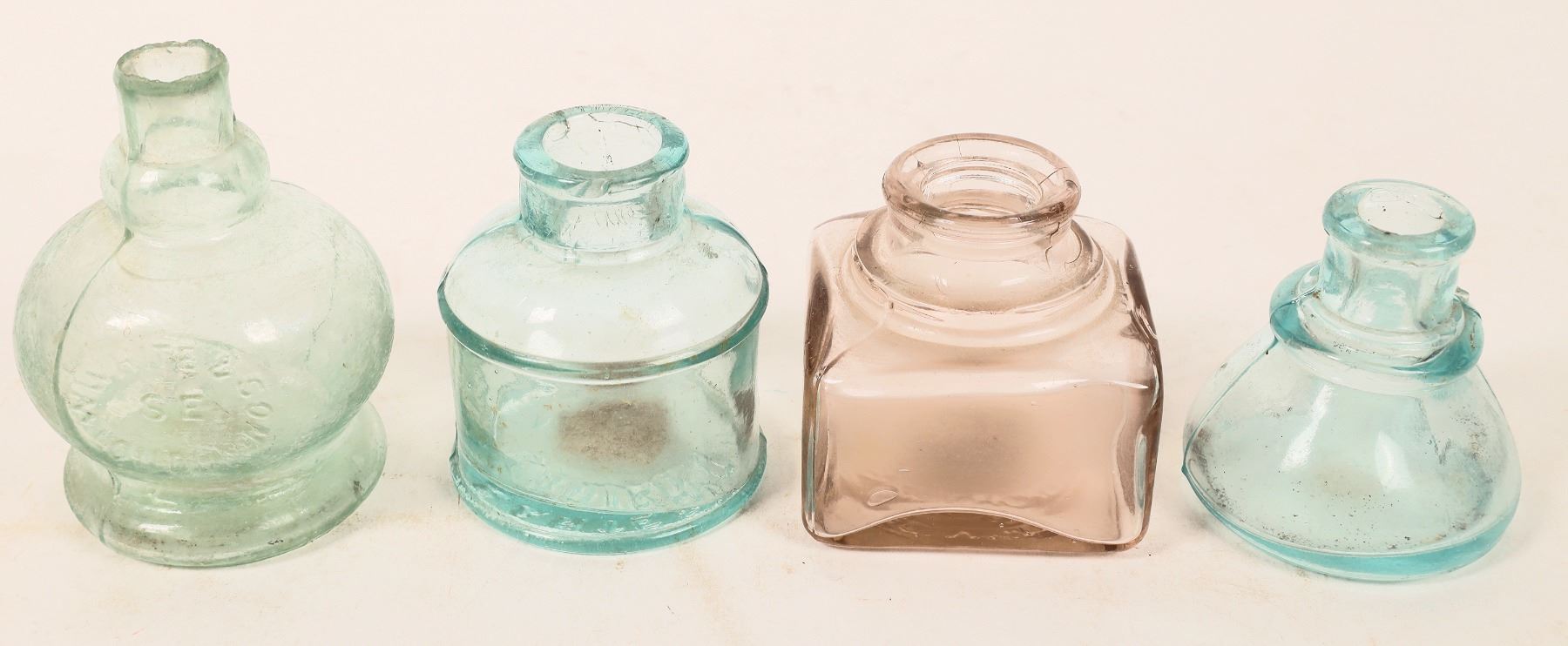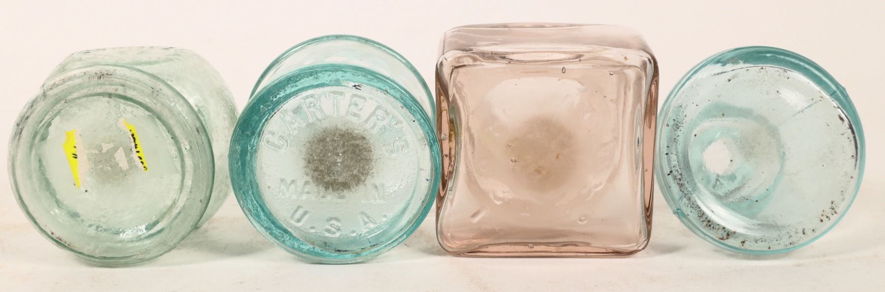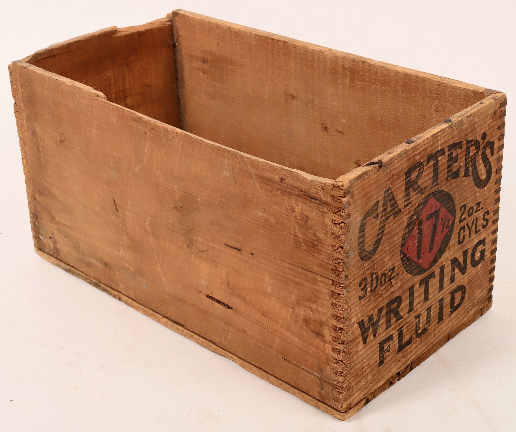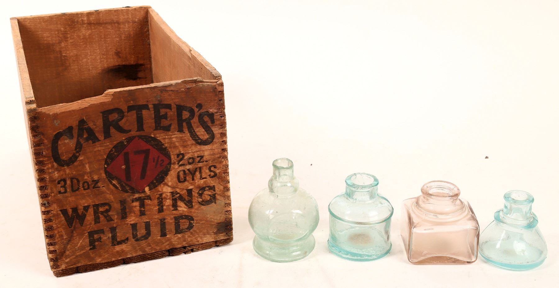 Wood Carter's Writing Fluid dovetail wood box, 7x13x7", 1 end panel has top chip. Aqua bulbous The Eureka ink bottle-lip chip, aqua Carter's, unidentified square and triangular bottles. Gary Bracken Collection